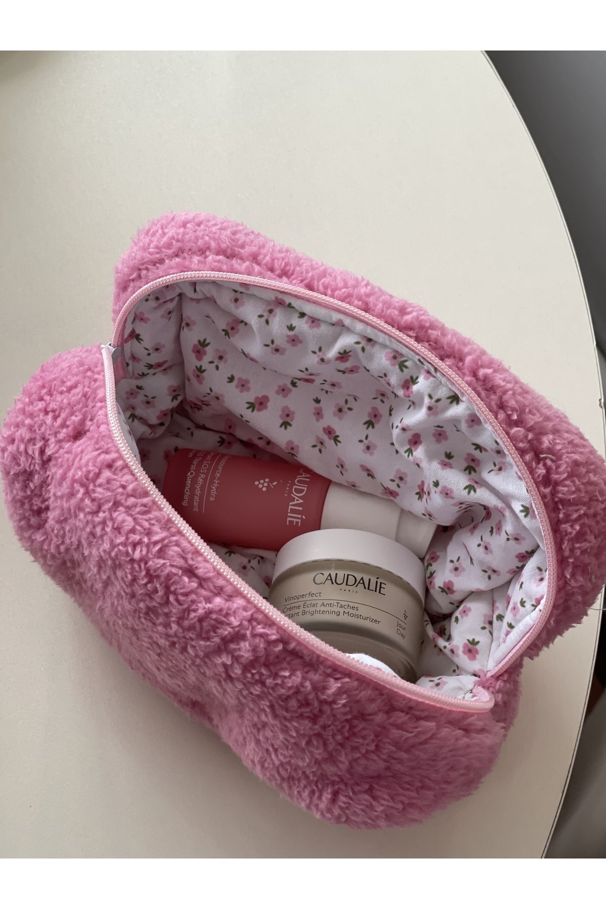 Yumuşacık pembe kürklü peluş çiçek desenleriyle süslenmiş, şık ve sevimli bir tasarıma sahip makyaj çantası