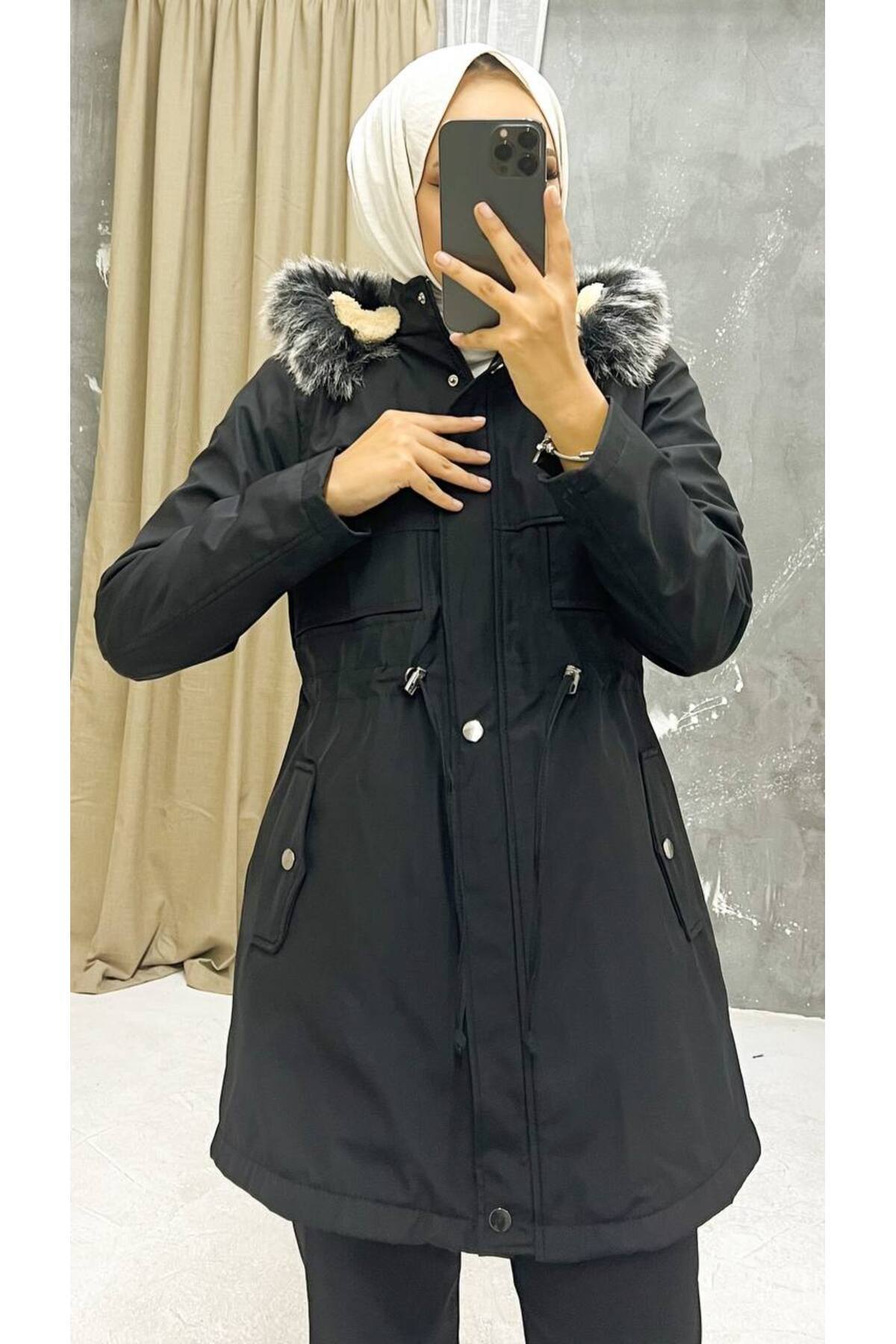 - Kış aylarında sıcak tutan ve su geçirmez özelliği ile her türlü hava koşulunda konfor sunan siyah içi kürklü mont.