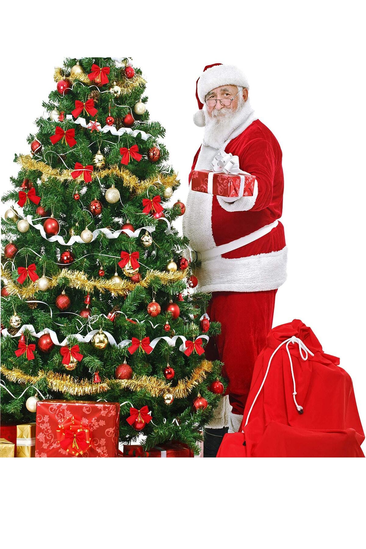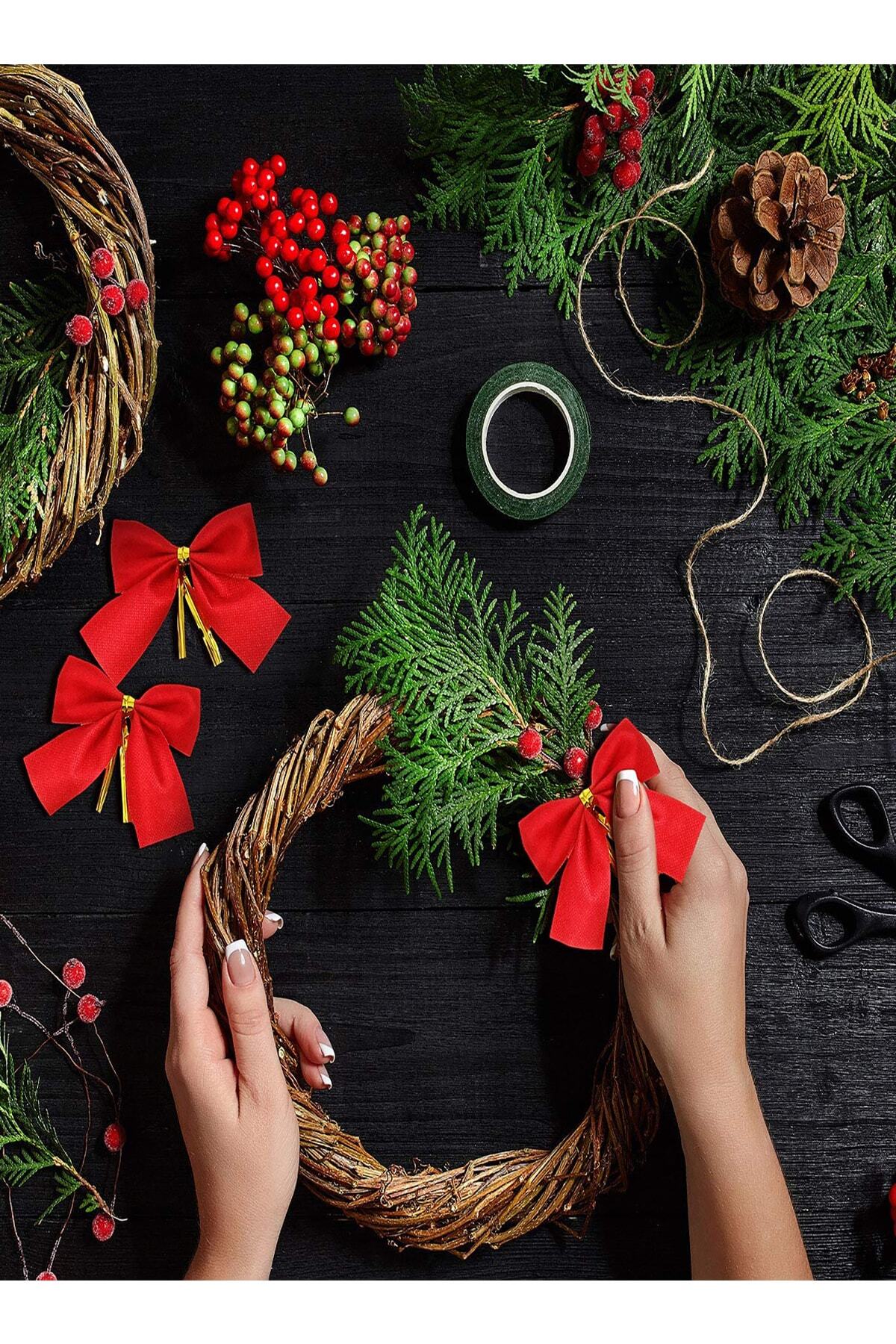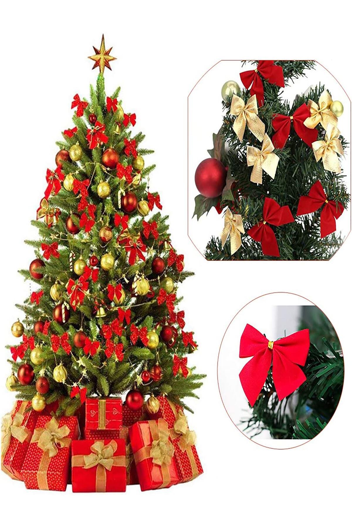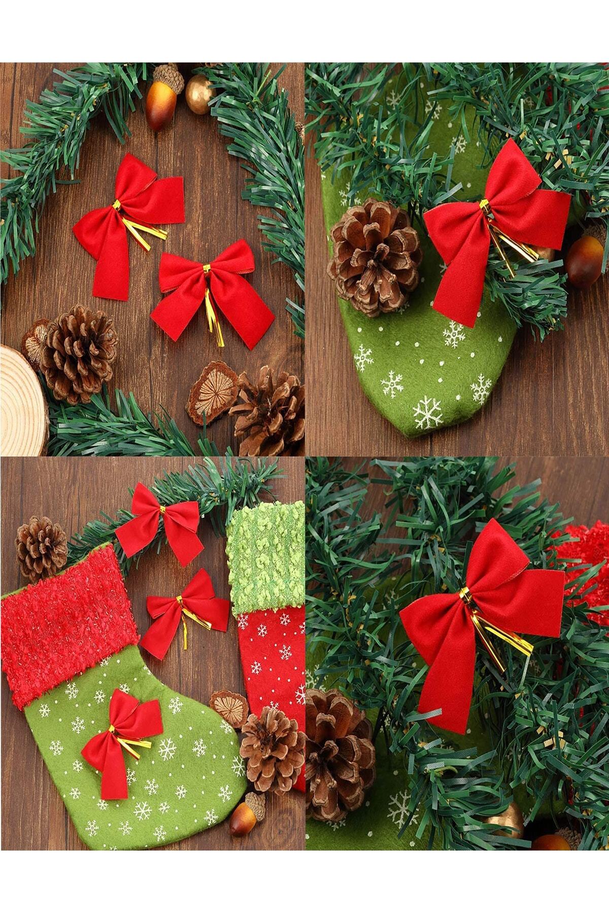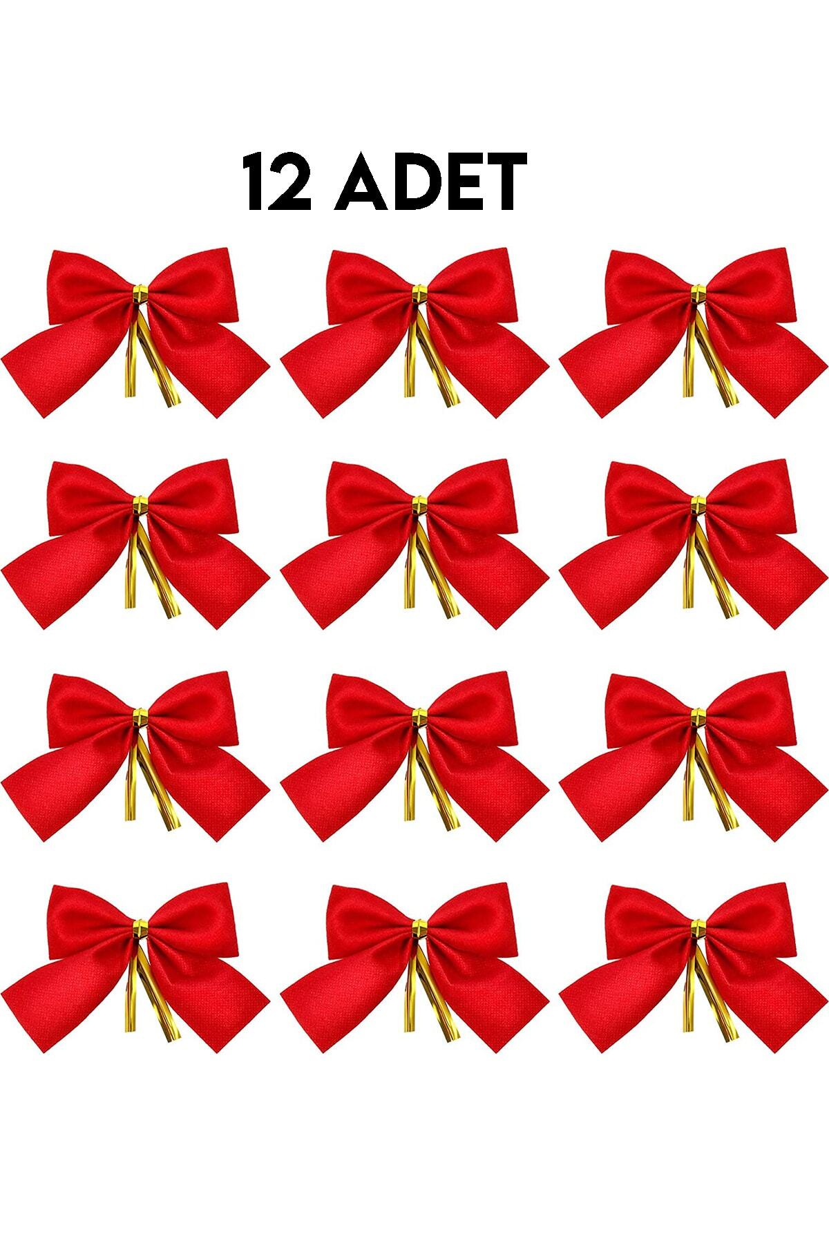 12 Adet Kırmızı Yılbaşı Çam Ağaçı Fiyonk Kurdele Yeni Yıl Noel Parti Dekorasyon Süsleri 7,5x5cm