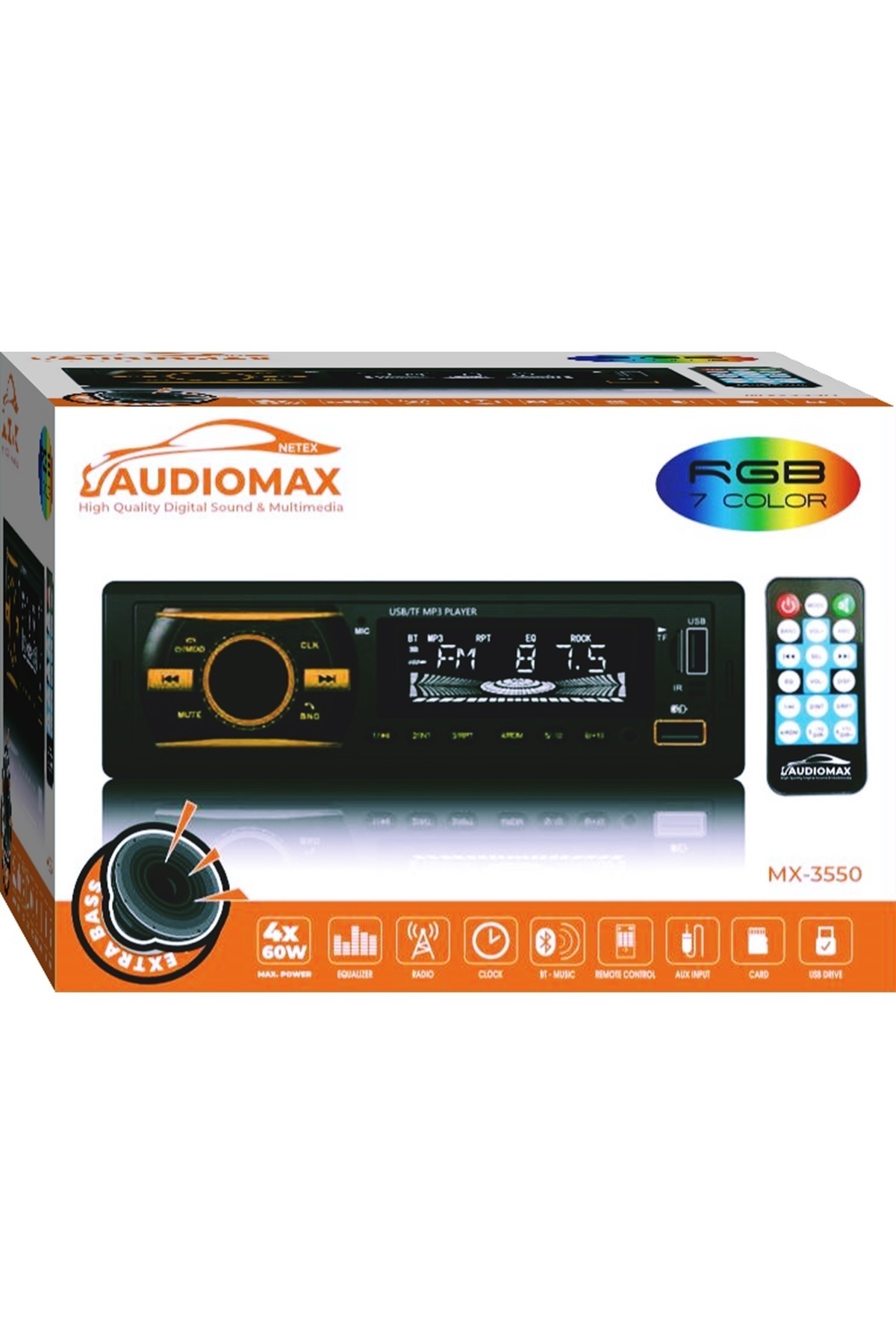 Mx-3550bt Çift Usb Araba Oto Teyp Radyo Bluetooth Usb Aux Rgb Tuş Işığı 4*60 (YENİ KUTU) AUDİOMAX 2 USB GİRİŞİ SAYESİNDE CEP TELEFON ŞARJ ETME ÖZELLİĞİ 7 RENK DEĞİŞEN TUŞ IŞIĞI BLUETOOTH USB AUX SD CARD OTO TEYP BLUETOOTH ÖZELLİĞİ SAYESİNDE TELEFONA BAĞLANABİLME, HADSFREE GÖRÜŞME VE MÜZİK DİNLEME LCD DİSPLAY ÖZELLİĞİ İLE SORUNSUZ GÖSTERGE USB SD KART İLE MÜZİK DİNLEME AUX KABLO İLE BAĞLANTI UZAKTAN KUMANDASI İLE HERŞEY KONTROL ALTINDA GÜÇLÜ RADYO FM DESTEĞİ 4*60WATT ÇIKIŞ İLE YÜKSEK SESTE KALİTELİ MÜZİK ANFİ ÇIKIŞLI ŞIK ÖN PANEL