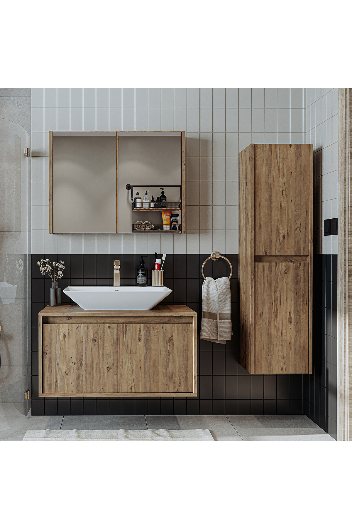Kahverengi banyo dolabı, içerdiği aynalı dolap, lavabo, lavabo altındaki dolap ve raflı dolap sayesinde geniş bir depolama alanı sunar.