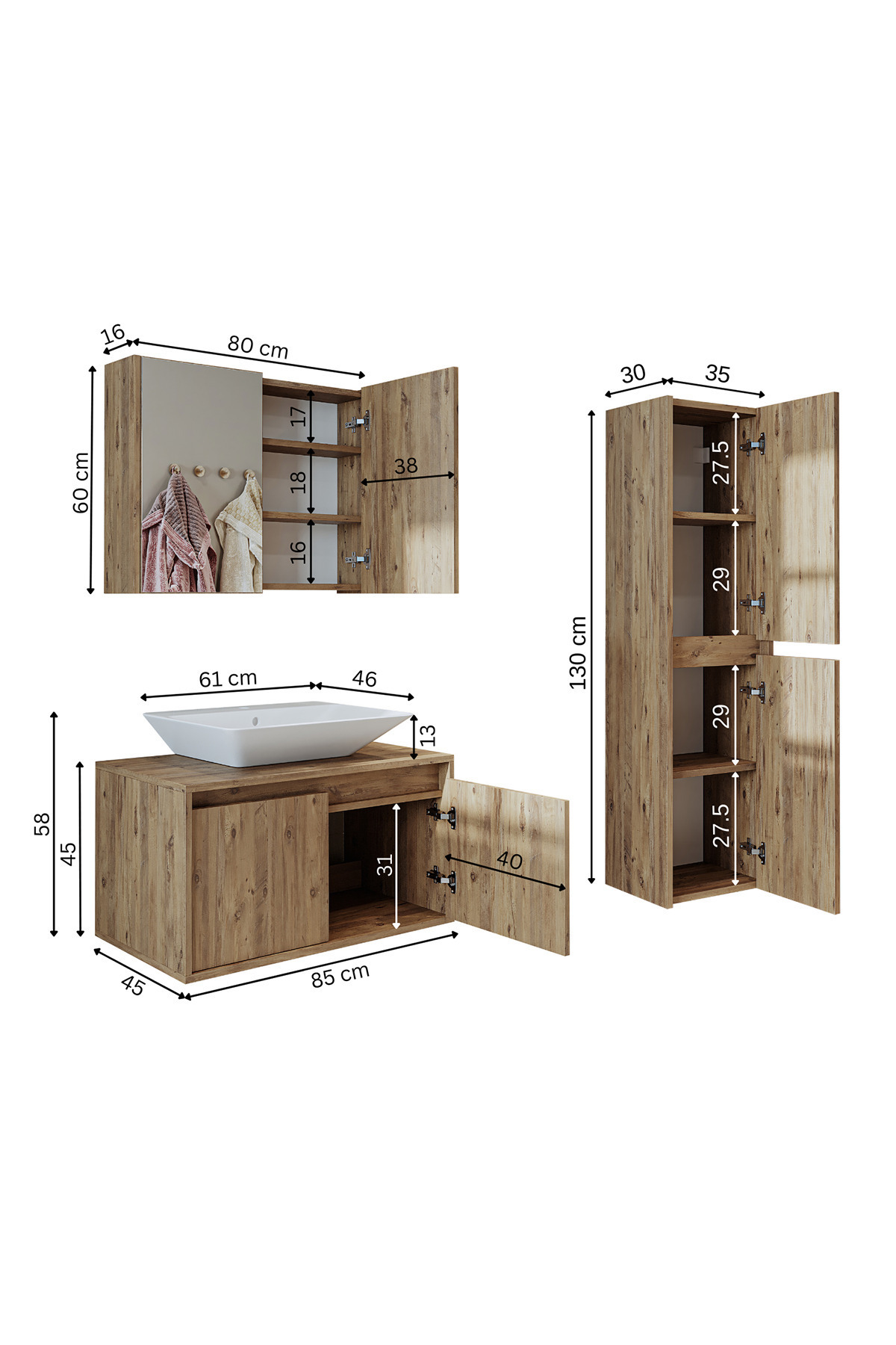 60 cm yükseklik, 80 cm genişlik olarak öne çıkar. Setin içinde bulunan raflı dolap ölçüleri ise