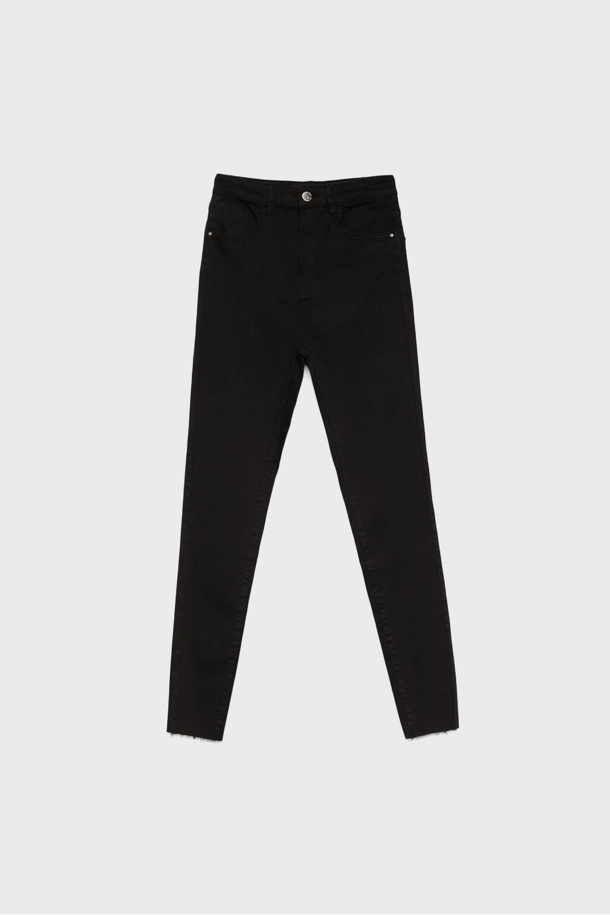 Fermuarlı ve üstü düğmeli, beş cepli, yüksek bel pantolon.