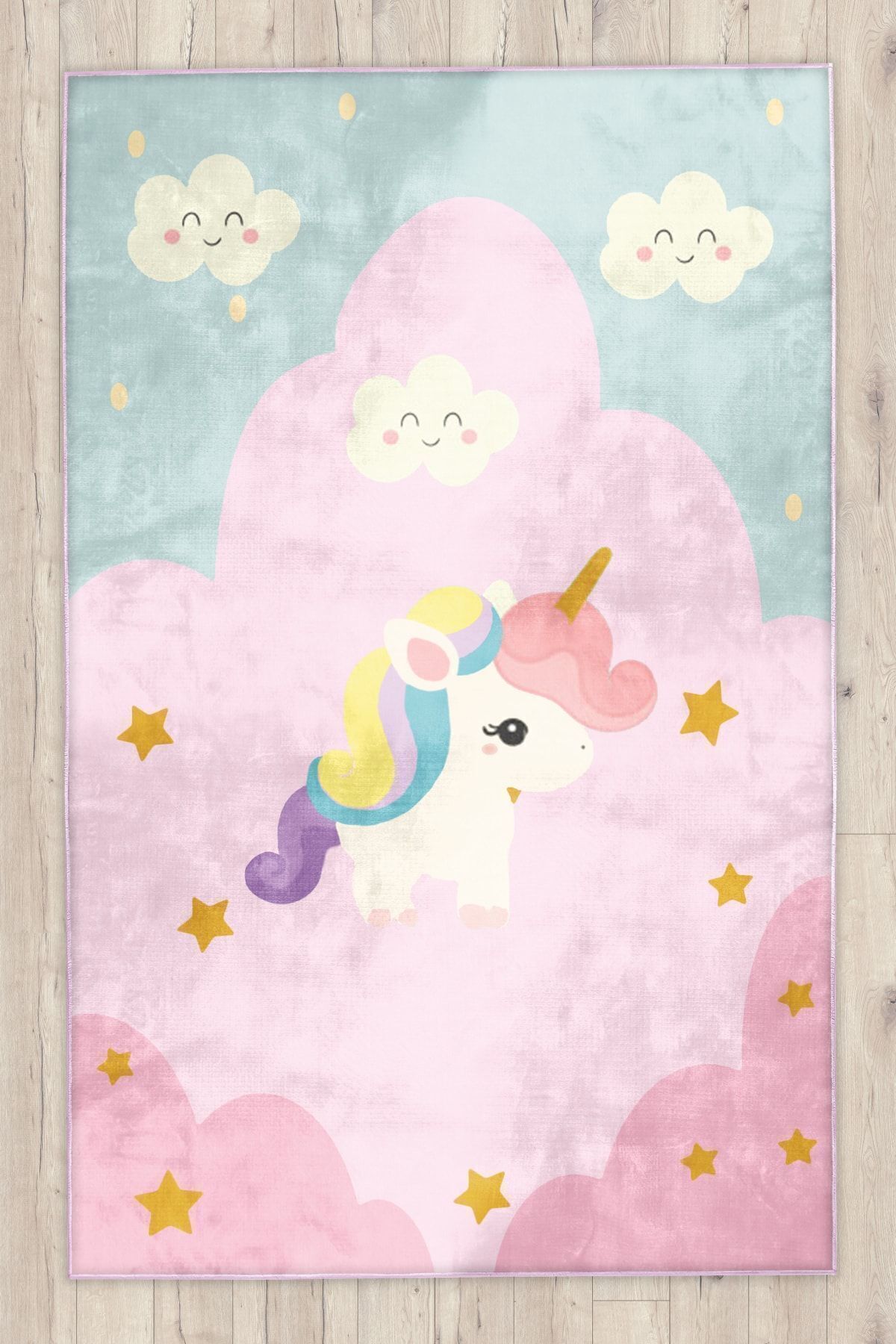 Çocuk odasında alan halısı olarak kullanılan, yumuşak, yıkanabilir bir halıdır.