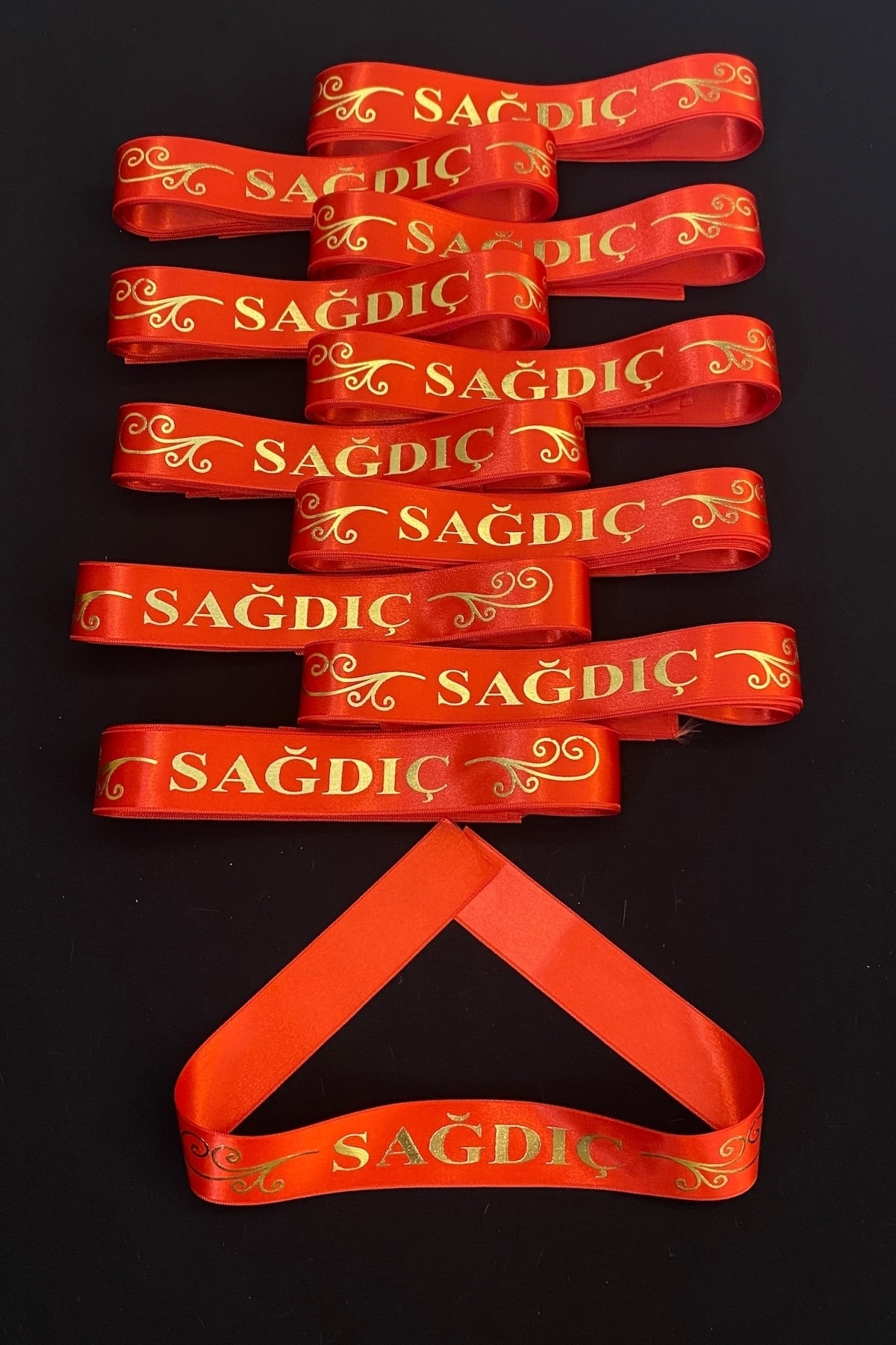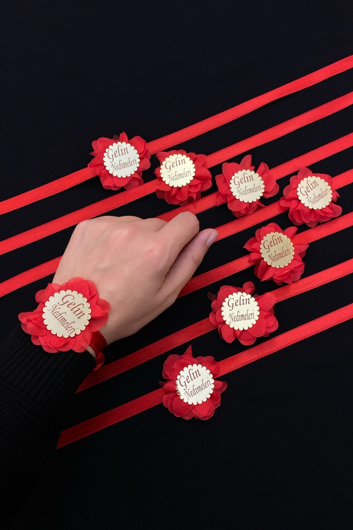 Zarif Kırmızı Renkteki Saten Kumaş Üzeri Varak Baskılı Nedime Kol Kurdelesi Bileklik Bant, Kına Gecelerinde Ve Düğünlerde Şıklığınızı Tamamlar.