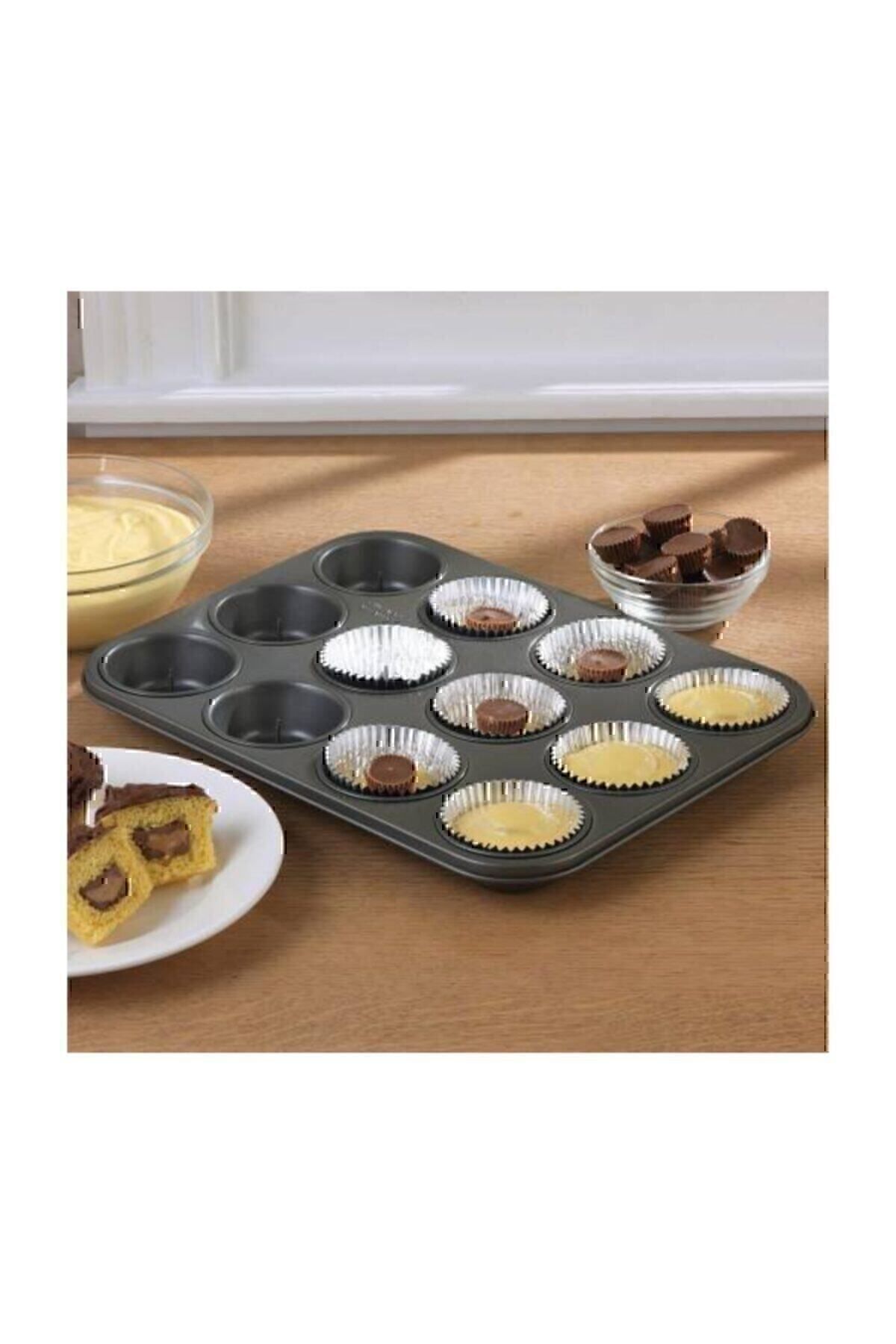 12'li Muffın Kalıbı Teflon Kek Kalıbı Karbon çelikten imal edilmiştir, yapışmaz kaplaması sayesinde kekler kalıptan çok kolay çıkar ve kullanım sonrası temiz kalır.