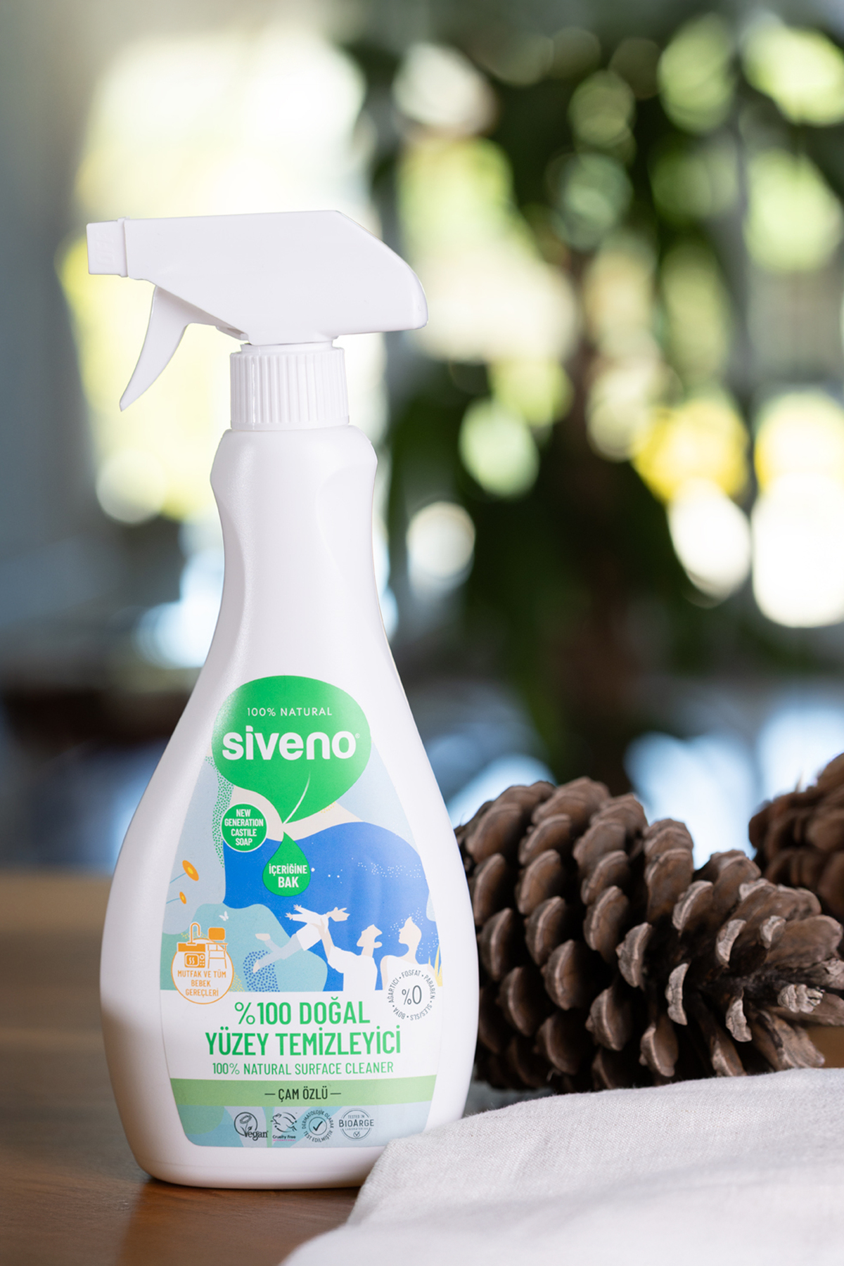 Siveno Doğal Yüzey Temizleyici içeriğindeki çam reçinesi ile yüzeyleri parlatarak, güvenli bir temizlik sağlar.