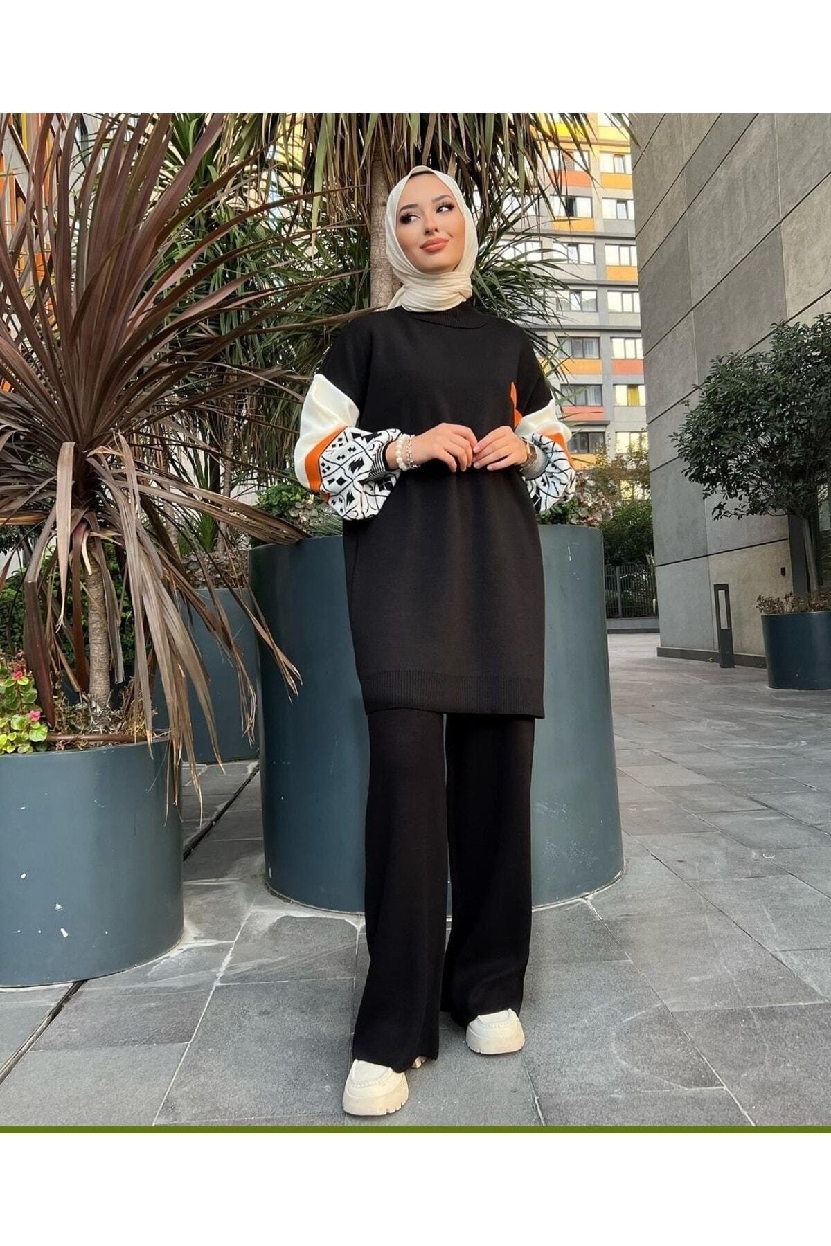 Klasik ve zamansız bir tarz sunan siyah kolları desenli triko tunik, her gardıropta yerini alacak bir parça