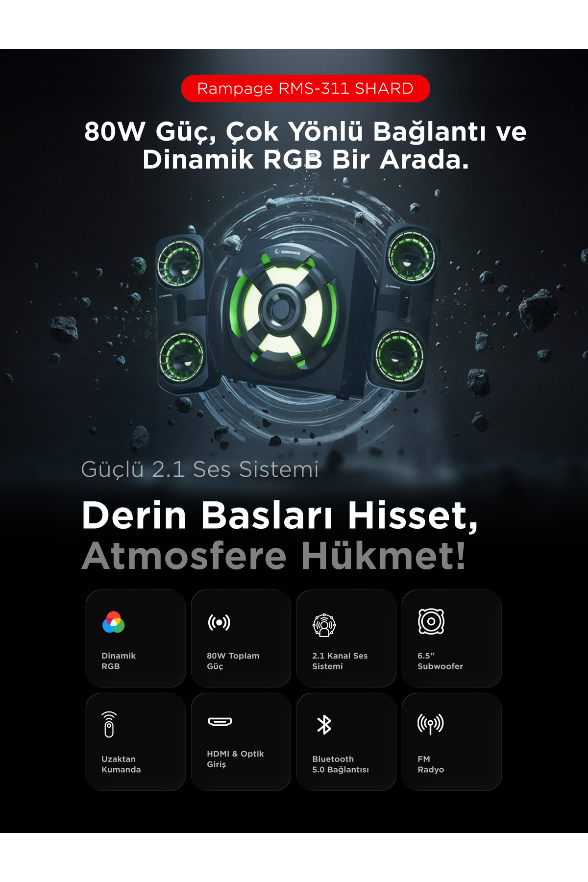 Rampage RMS 311 Shard 2 1 80W modelinde kullanılan derin bas teknolojisi müziği ve basları en kaliteli şekilde iletir.
