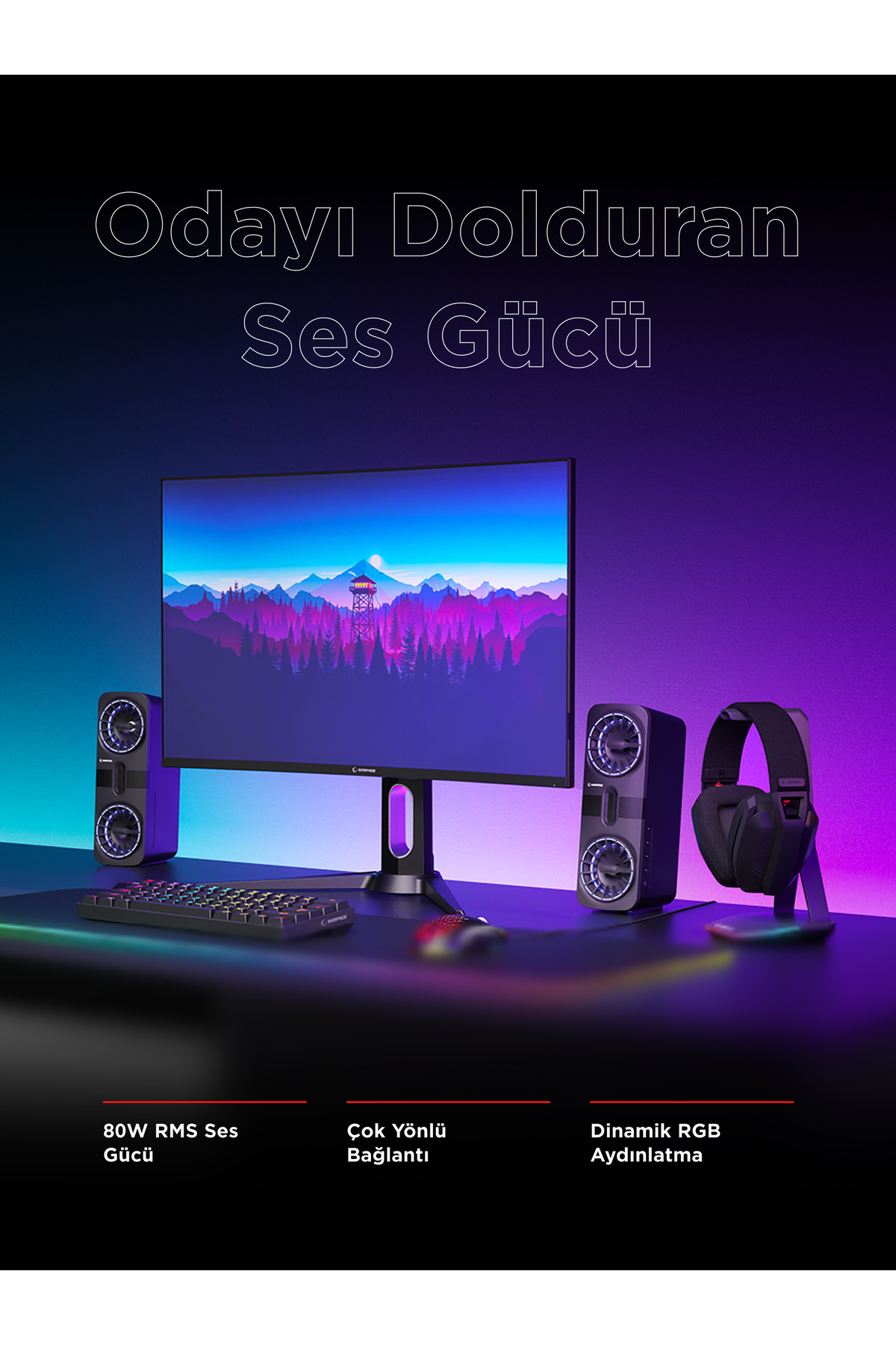 Rampage RMS-311 Shard 2+1 80W RGB ışıklı hoparlör siyah rengiyle dikkat çekerken FM ve RADYO modları sayesinde günlük kullanım için de uygundur.