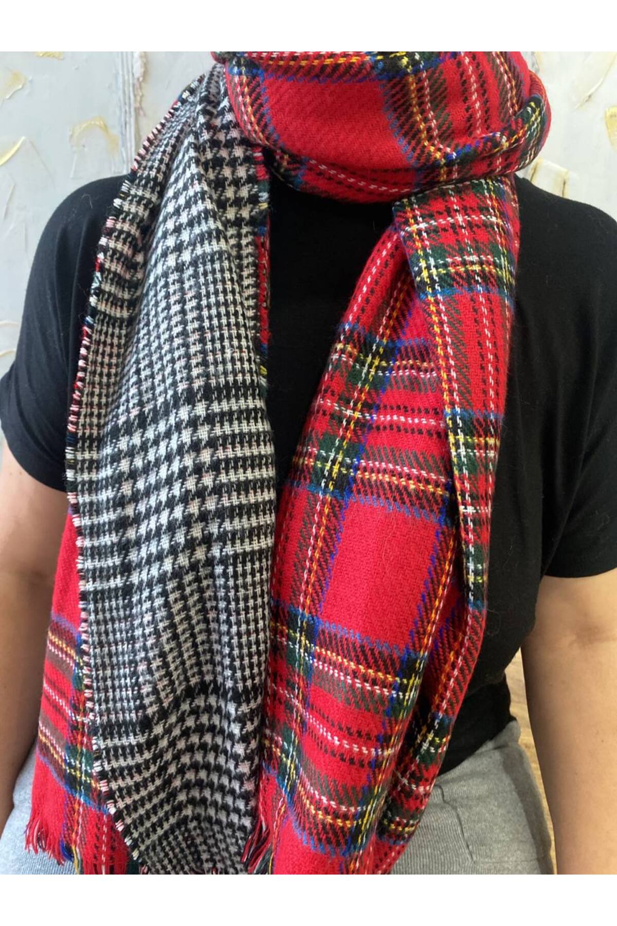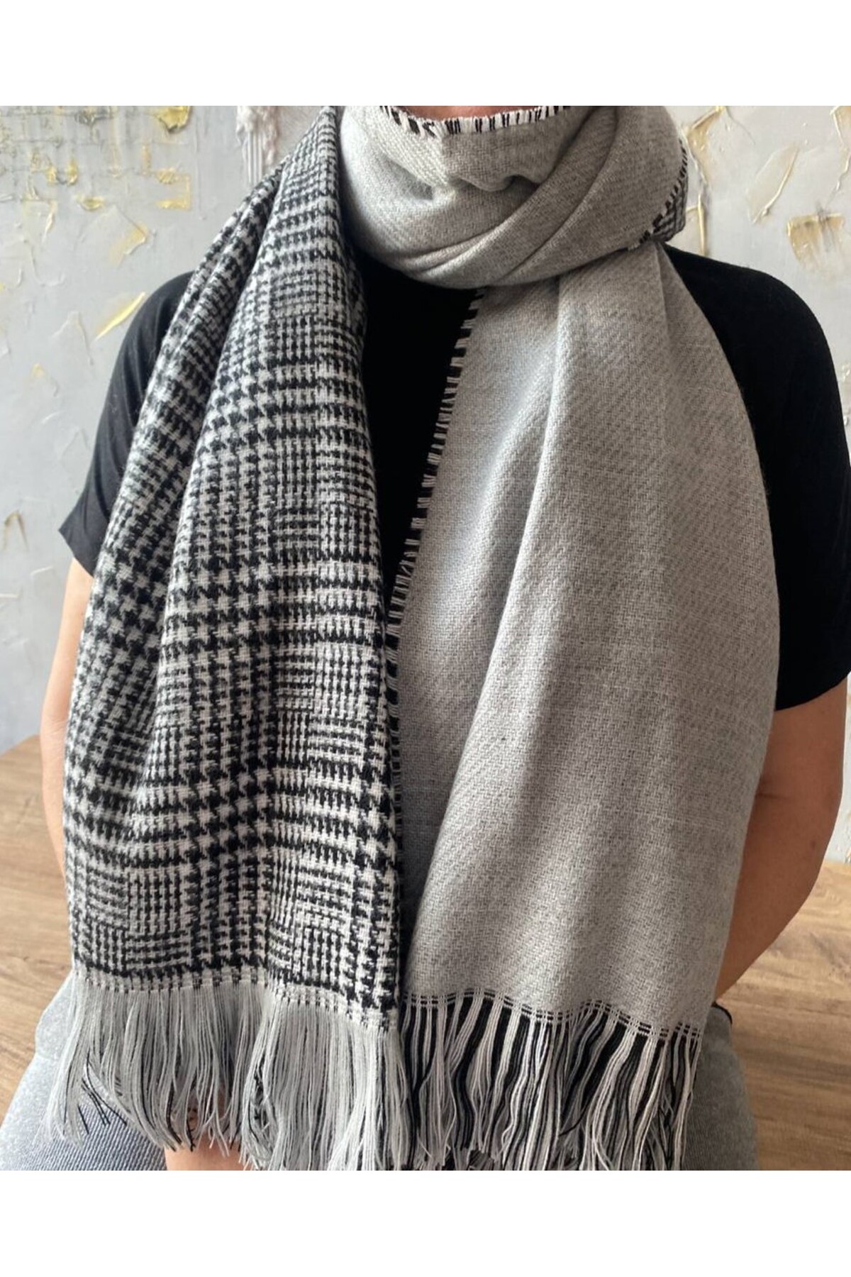 - Çift taraflı kalın yapısı ile mevsim geçişlerinde ideal bir aksesuar olarak öne çıkar ve şıklığınızı tamamlar