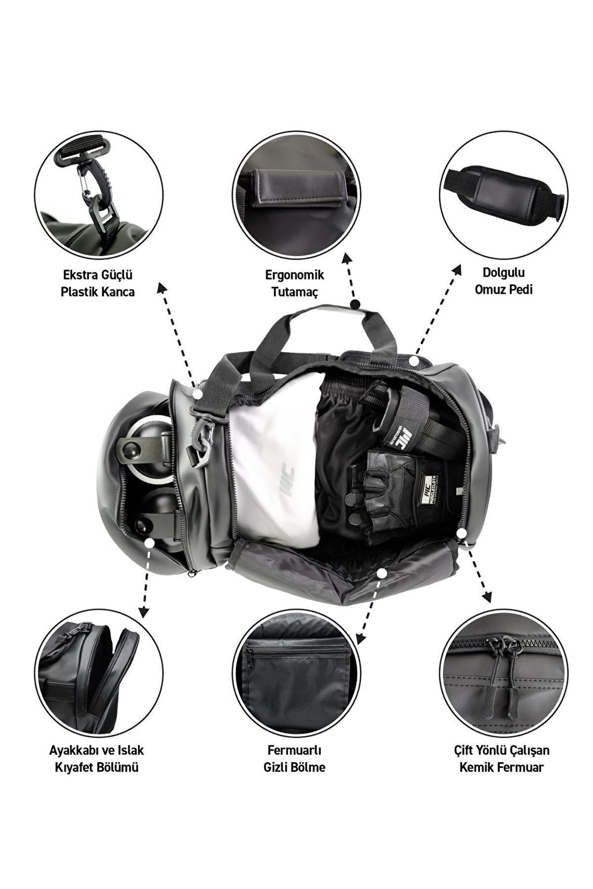 MuscleCloth Elite Duffel Bag Silindir Spor Çanta Siyah Açıklama Estetik ve konforu bir arada sunan MuscleCloth Elite Duffel Bag, spora giderken ya da günlük yaşamınızda temel ihtiyaçlarınızın tümünü kolayca taşıyabileceğiniz pratik bir üründür. Ana bölme içerisindeki eşyaları daha rahat görebilmeniz için, ürünün üst kapağı hem dayanıklılığını arttıran hem de estetik bir görünüm sunan, çift yönlü çalışan kemik fermuarla şekillendirilmiştir. Geniş ana bölmesinin yanında, fermuarlı yan bölmesi ve iç bölümde konumlandırılmış özel eşya taşıma cebi bulunmaktadır. İster elde ister omuzda taşınabilen MuscleCloth Elite Duffel Bag, konforu arttırılmış yastıklı üst tutma sapına ve ayarlanabilir omuz askısına sahiptir. MuscleCloth Elite Duffel Bag Silindir Spor Çanta Siyah Özellikleri: Su iticilik özelliği olan dayanıklı suni deri kumaş