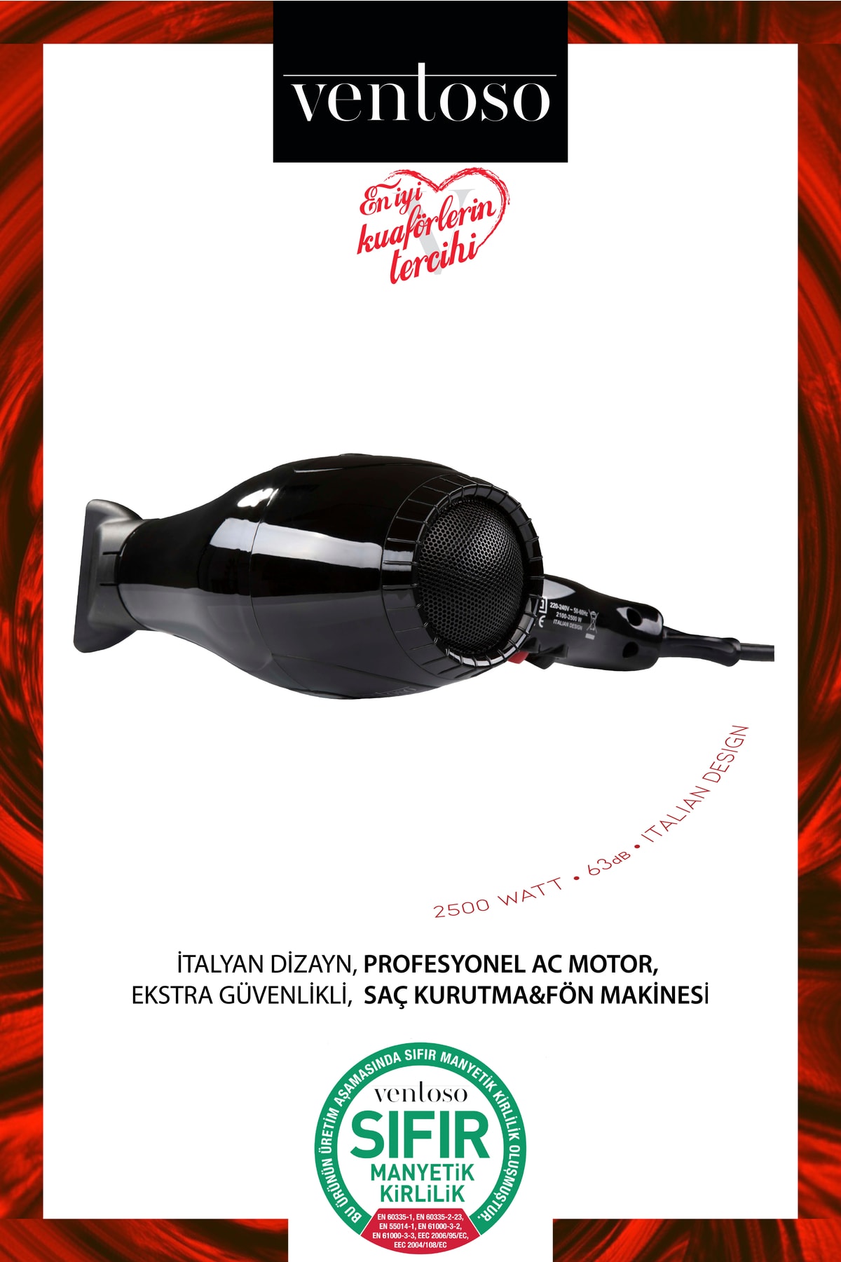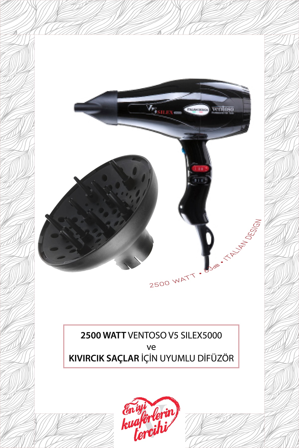 Ventoso V5 Silex5000 Profesyonel Kuaför Fön Makinesi, İtalyan dizayn ve teknolojisi ile arka bölümde yaratılan özel huni tasarım motorun çıkardığı sesin bir kısmını içeri hapsederek ses seviyesini 63dB’e düşürüyor ve uzun saatler boyunca fön makinesi kullanmak zorunda kalan profesyonellere yine ‘KUAFÖR DOSTU ÜRÜN’ olarak hizmet veriyor… Bireysel, ev kullanımına uygun olup saçın kalınlığına göre hız ve ısı ayarlarını kullanarak istediğiniz güç seviyesini kullanabilir ve arzu ettiğiniz sonuca ulaşabilirsiniz.