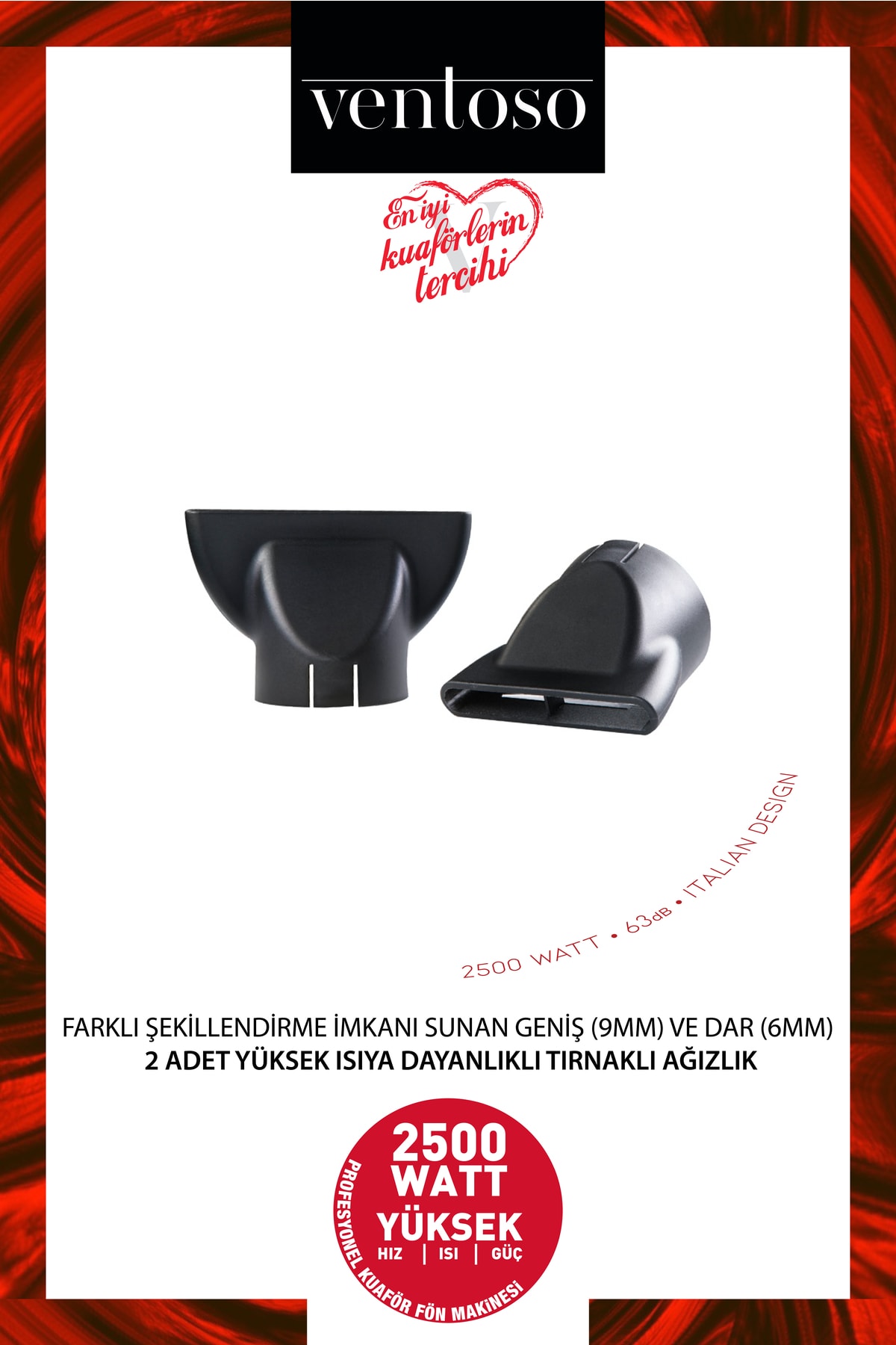 Saçlarınıza profesyonel dokunuşları her yere götürebileceğiniz Ventoso Saç Şekillendirme Setiyle, saçlarınız hep muhteşem gözüksün! “En İyi Kuaförlerin Tercihi” Ventoso, 63dB ses seviyesindeki V5 Silex5000 modeliyle fark yaratıyor.