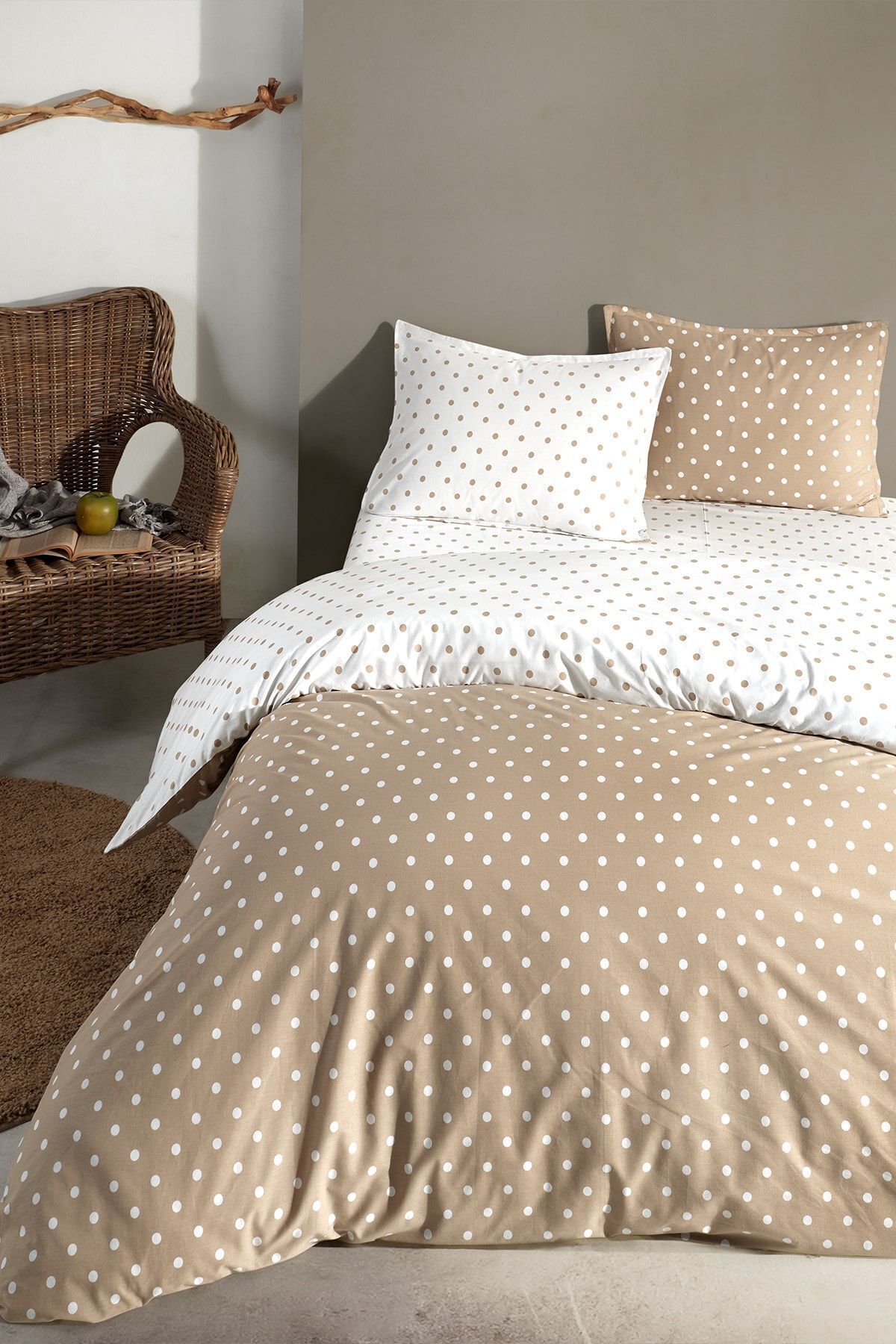 Nevresim ve yastık kılıfının bir yüzü kahverengi zemin üzerine beyaz noktalı, diğer yüzü beyaz zemin üzerine kahverengi noktalıdır.