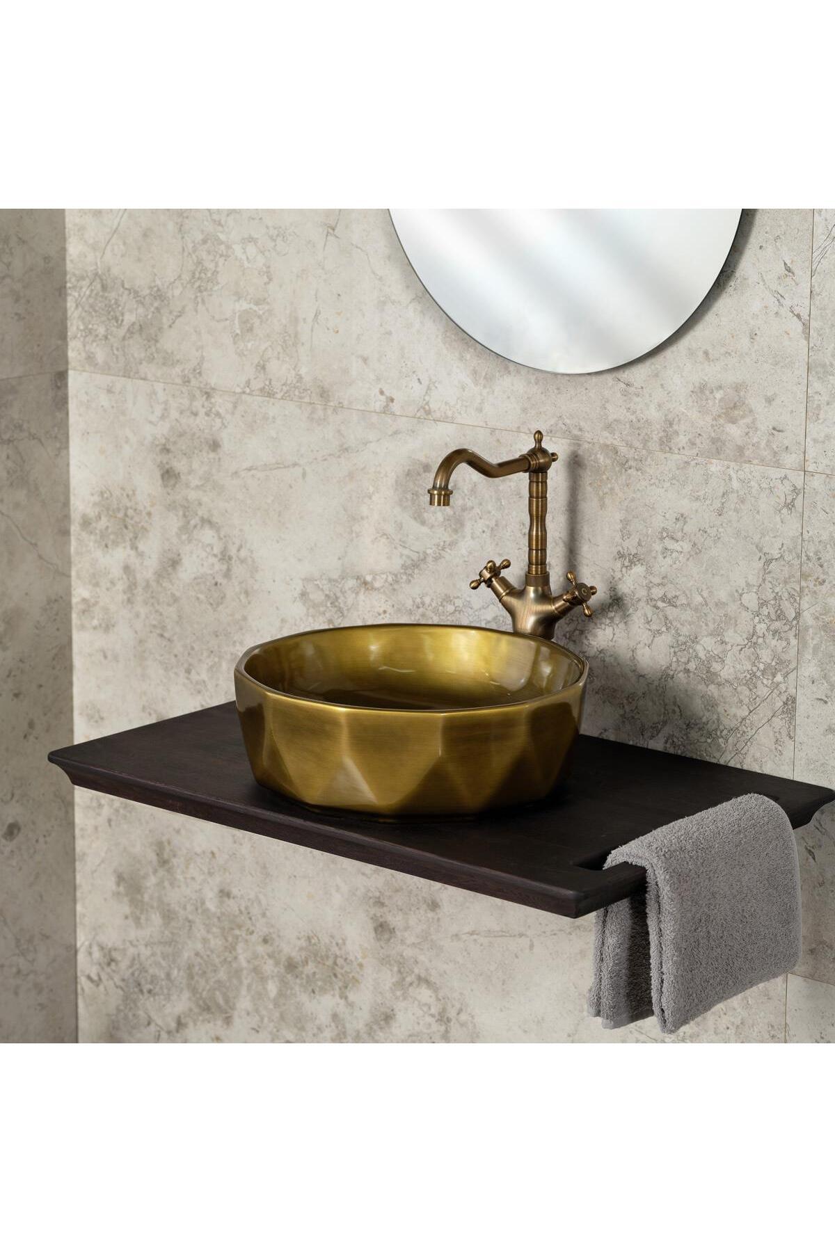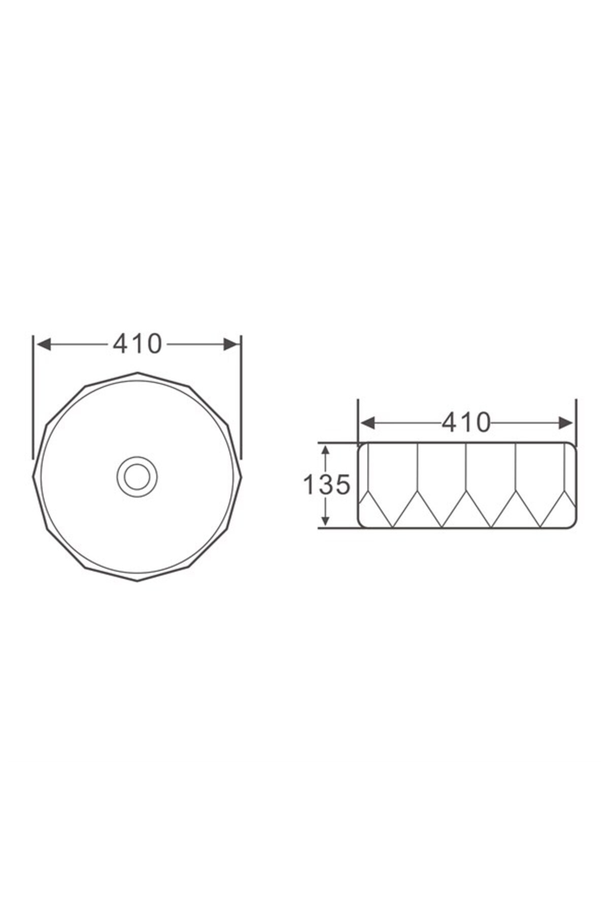 E-2110BR TEZGAH ÜSTÜ PORSELEN LAVABO *Yuvarlak formda dış yüzeyi köşeli çizgilere sahip özel tasarım bakır tezgah üstü lavabo *Renk: Bakır *Batarya deliksiz *Su taşma deliksiz *Ölçüler: 410x410x135mm **Batarya fiyata dahil değidlr.