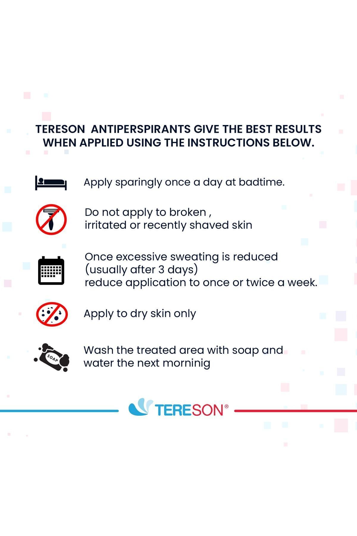 Tereson aşırı terlemeyi önlemeye karşı özel olarak geliştirilmiş etkili bir sprey antiperspiranttır. Koltuk altı, ayak ve el terlemelerinde kullanım için idealdir. Dermatolojik olarak test edilmiştir. Başlangıç olarak her gece yatmadan önce kullanılır. Etkisi ertesi gün hissedilmeye başlayacaktır. Terlemeyi 1-2 günde kontrol altına alacaktır. Terleme kontrol altına alındıktan sonra kullanmaya ara verilebilir. İçeriği