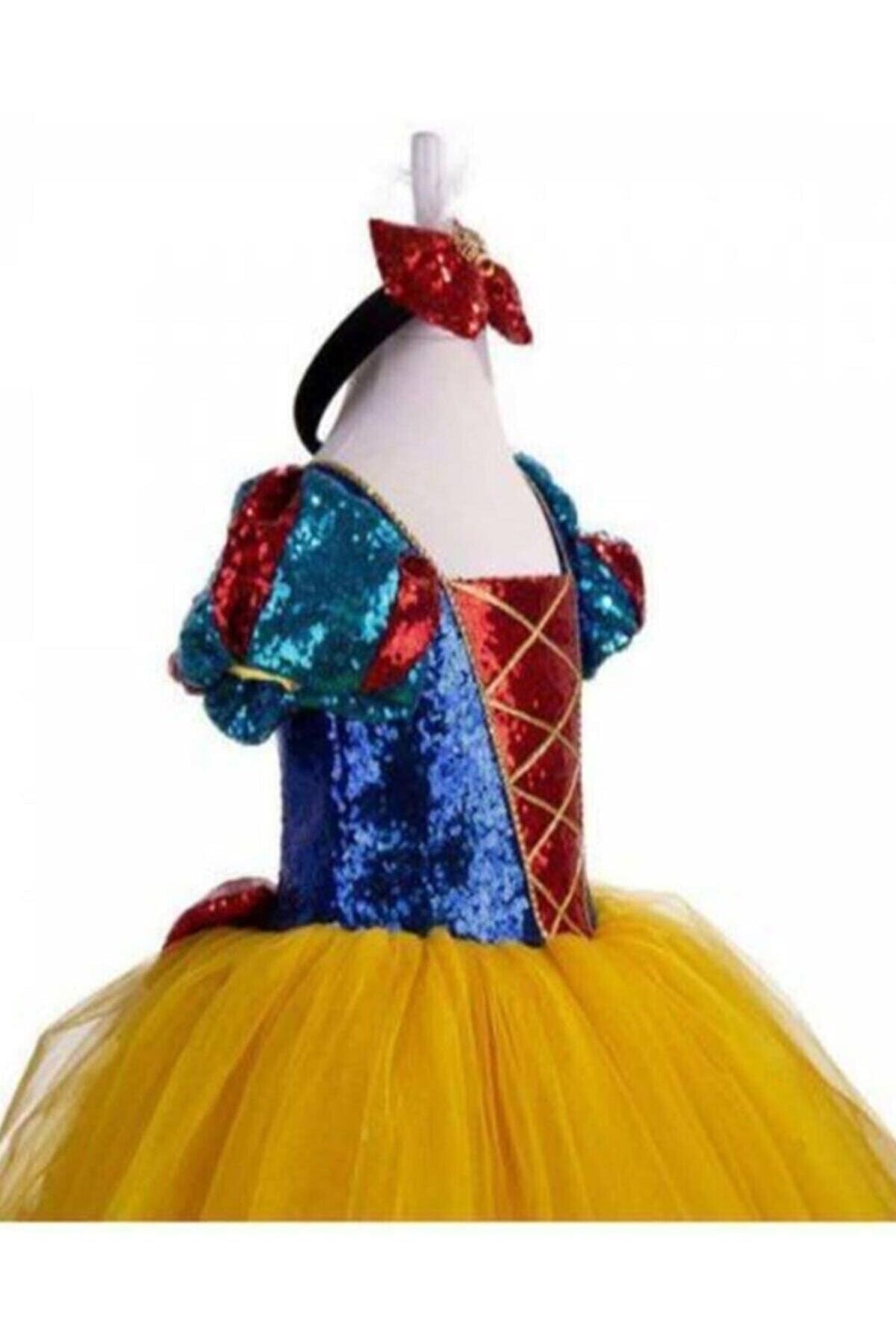 1 adet pamuk prenses kostüm 1 adet prenses tacı 1 adet tarlatan 1 adet pelerin kolları da dahil komple astarlı pul payet beden sırt kısmı komple lastik beden saten üzerine 3 kat tül ile kabartılmış etek ürün görseldeki gibidir