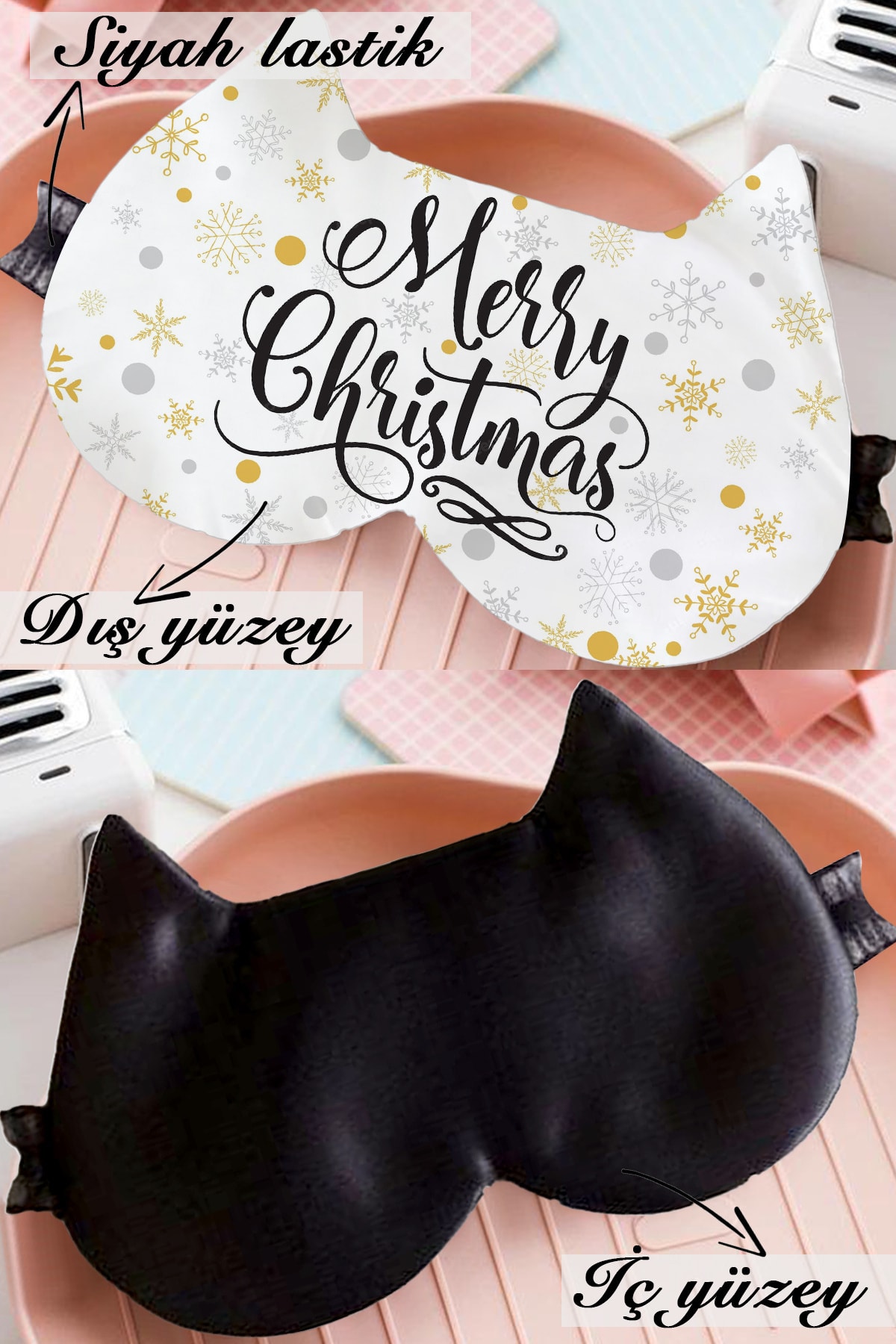 Uyku bandının ön yüzeyi beyaz baskılı saten, iç/arka yüzeyi ve lastiği siyah saten kumaştan üretilmiştir.
