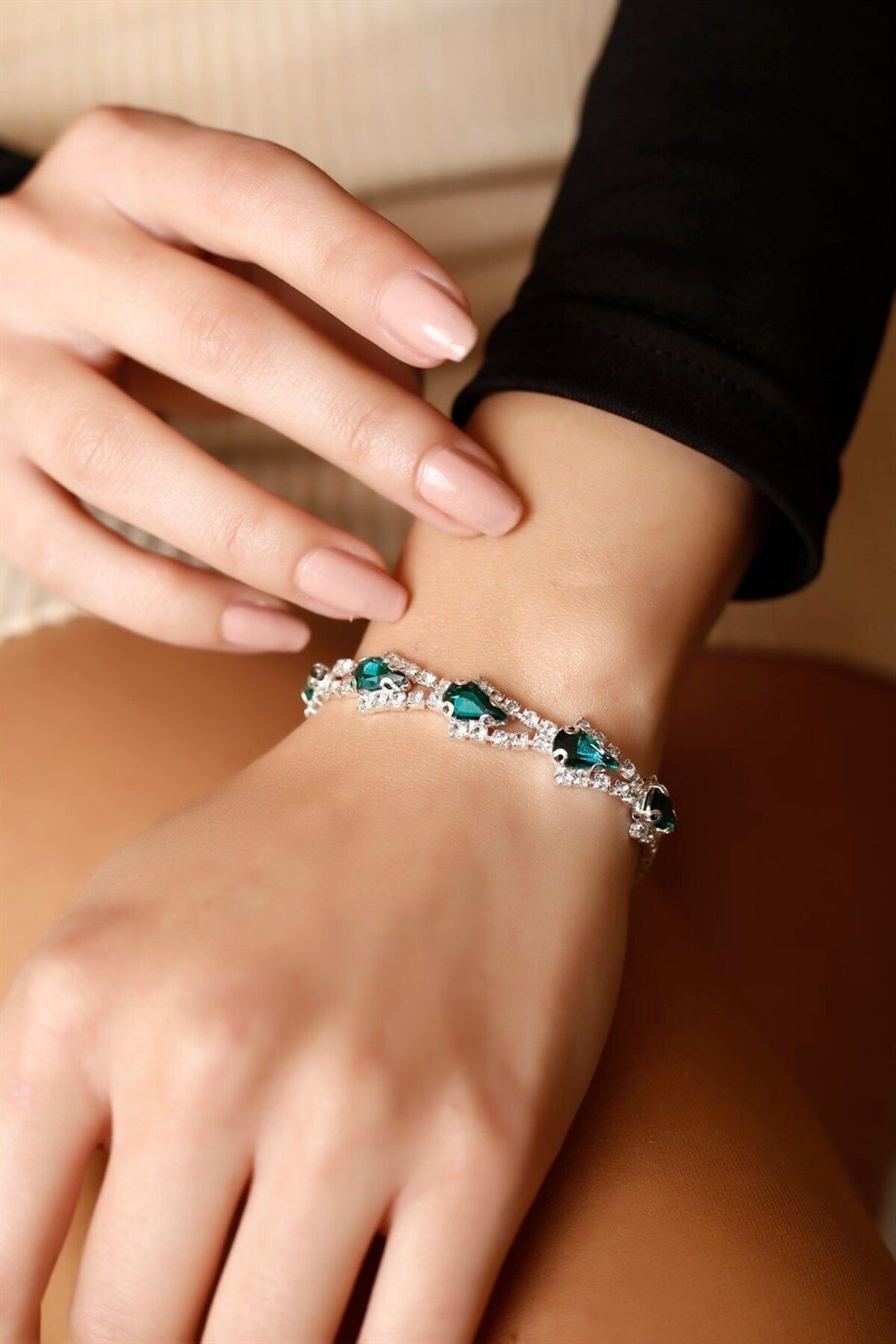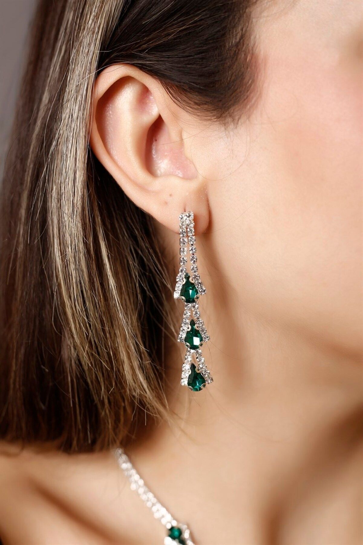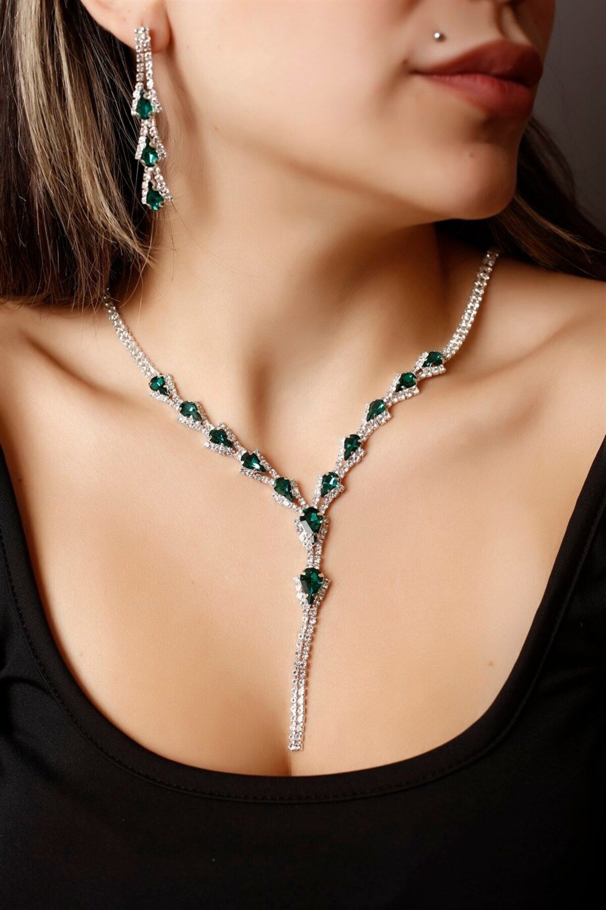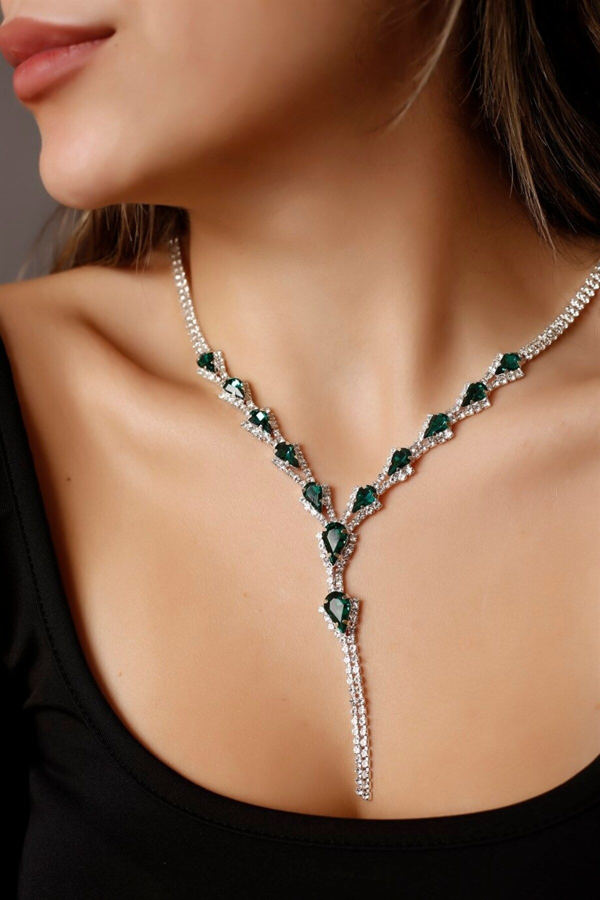 - Zarif tasarımıyla dikkat çeken gümüş kaplama yeşil damla taşlı su yolu kolye, küpe ve bileklik seti, özel günlerinizde şıklığınızı tamamlar