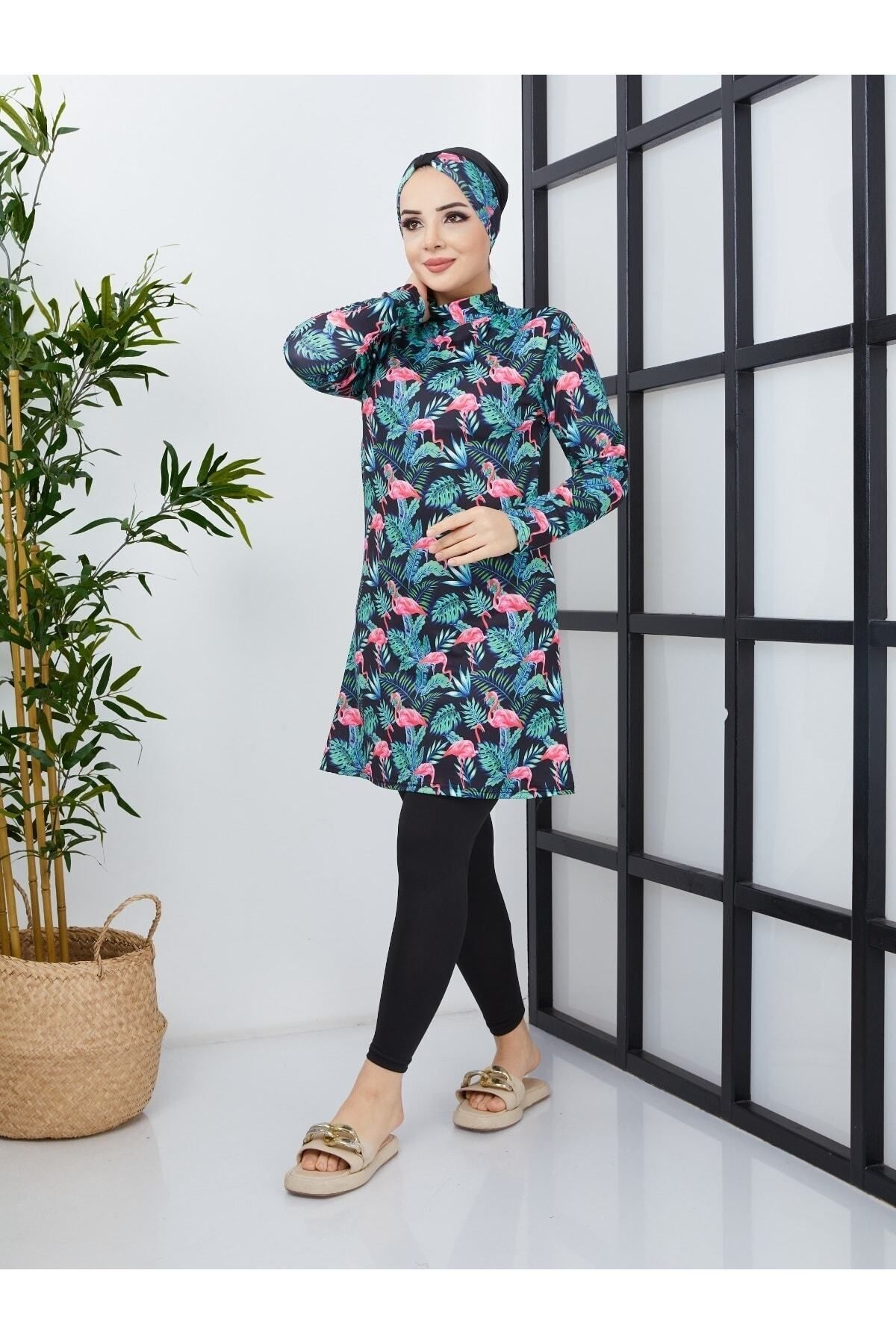 Şal deseniyle göz alıcı bir stil oluştururken, tesettür mayonuzun şıklığını tamamlar