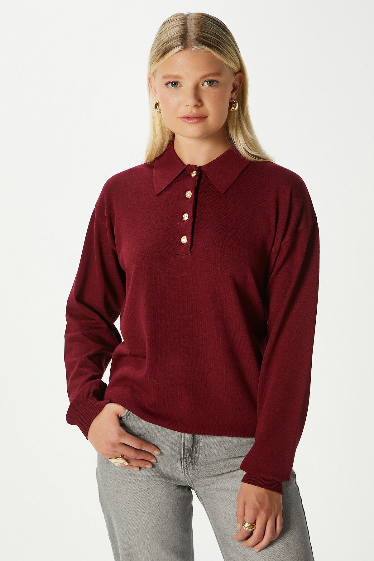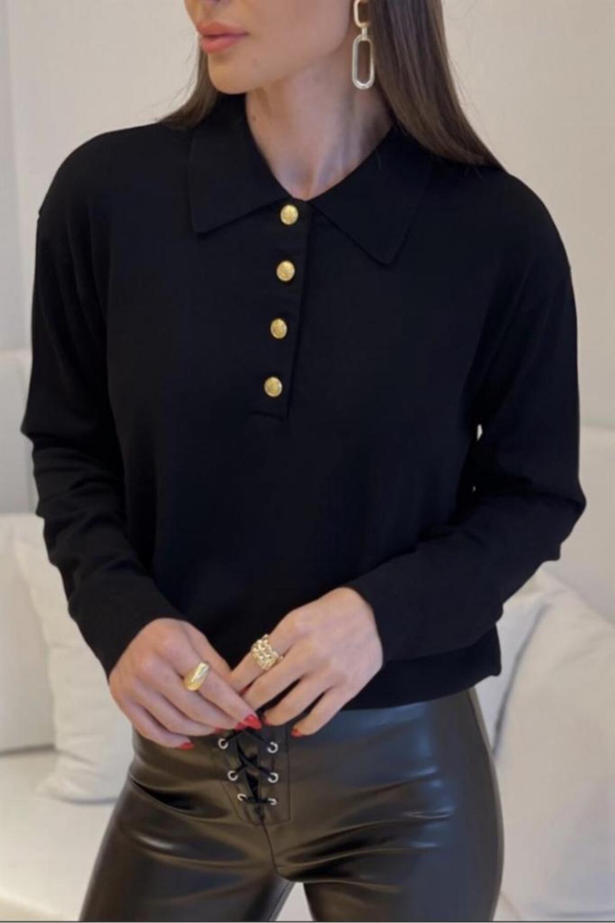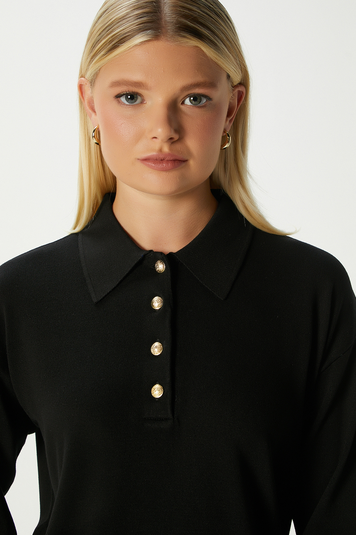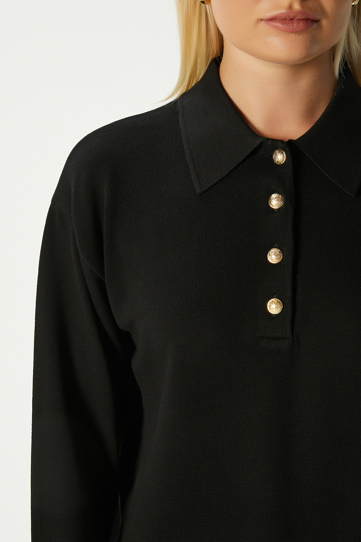 Kadın Watch Premium Doku Polo Yaka Siyah Gold Düğmeli Triko Kazak - Yumuşak dokusuyla öne çıkan %70 viskon ve %30 poliamid karışımından üretilmiş, cildinize nazik bir dokunuş sunar.