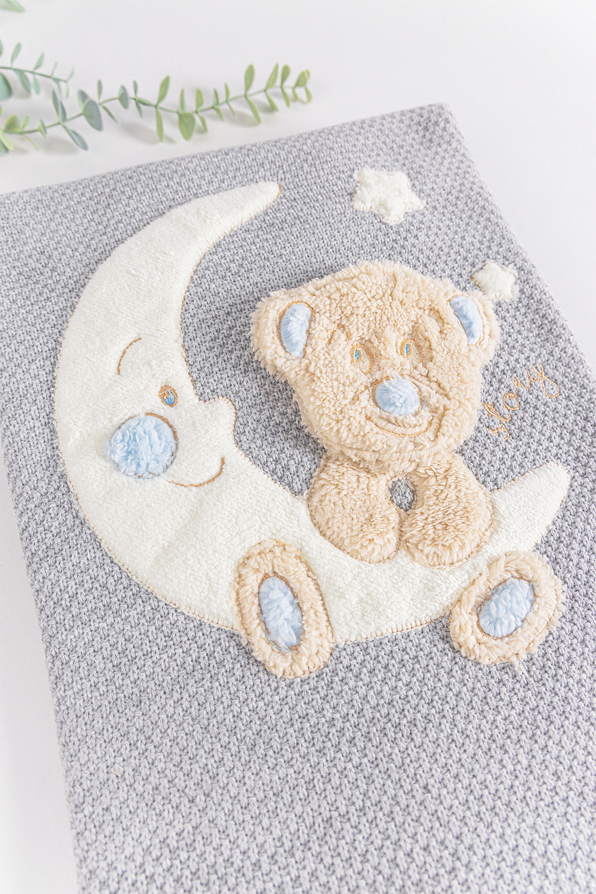Bebek battaniyenin ön kısmında ay, yıldız ve ayıcık figürleri mevcuttur.