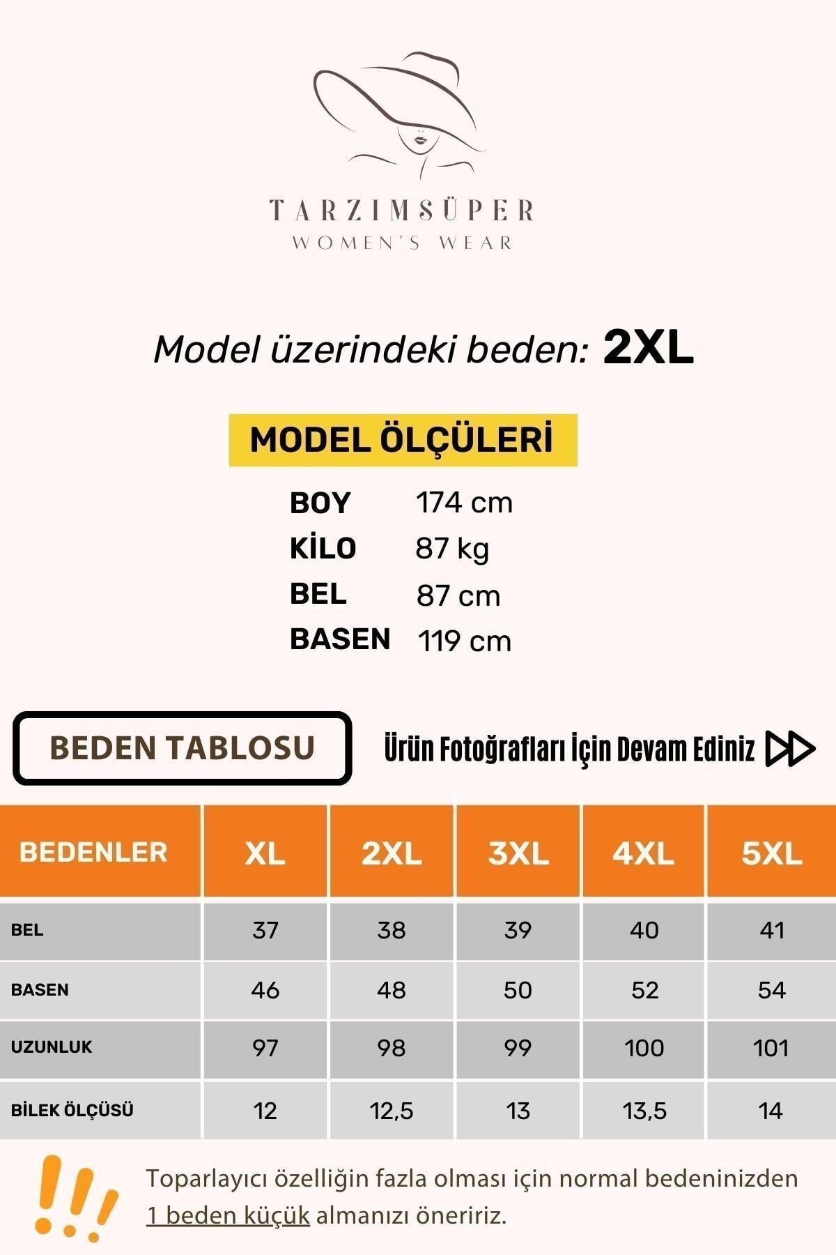 Model Ölçüleri: Kilo 87, Bel 87, Basen 119, Boy 174 cm