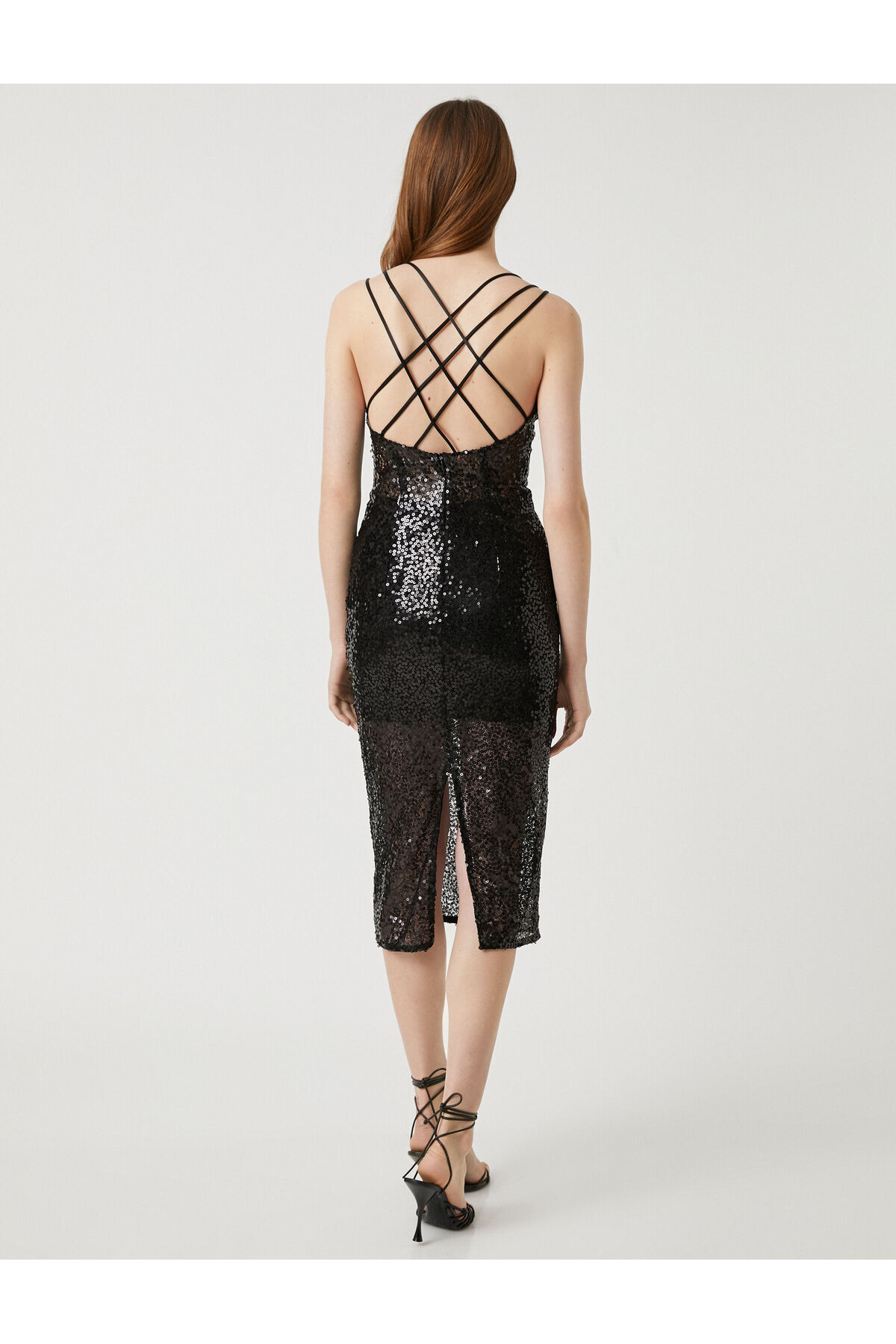 Siz de yırtmaçlı, yarı astarlı, payetli midi boy abiye elbise ile davetlerde göz kamaştırın! Bu ürün pul, boncuk, payet, taş ve nakış gibi özel detaylara sahiptir.
