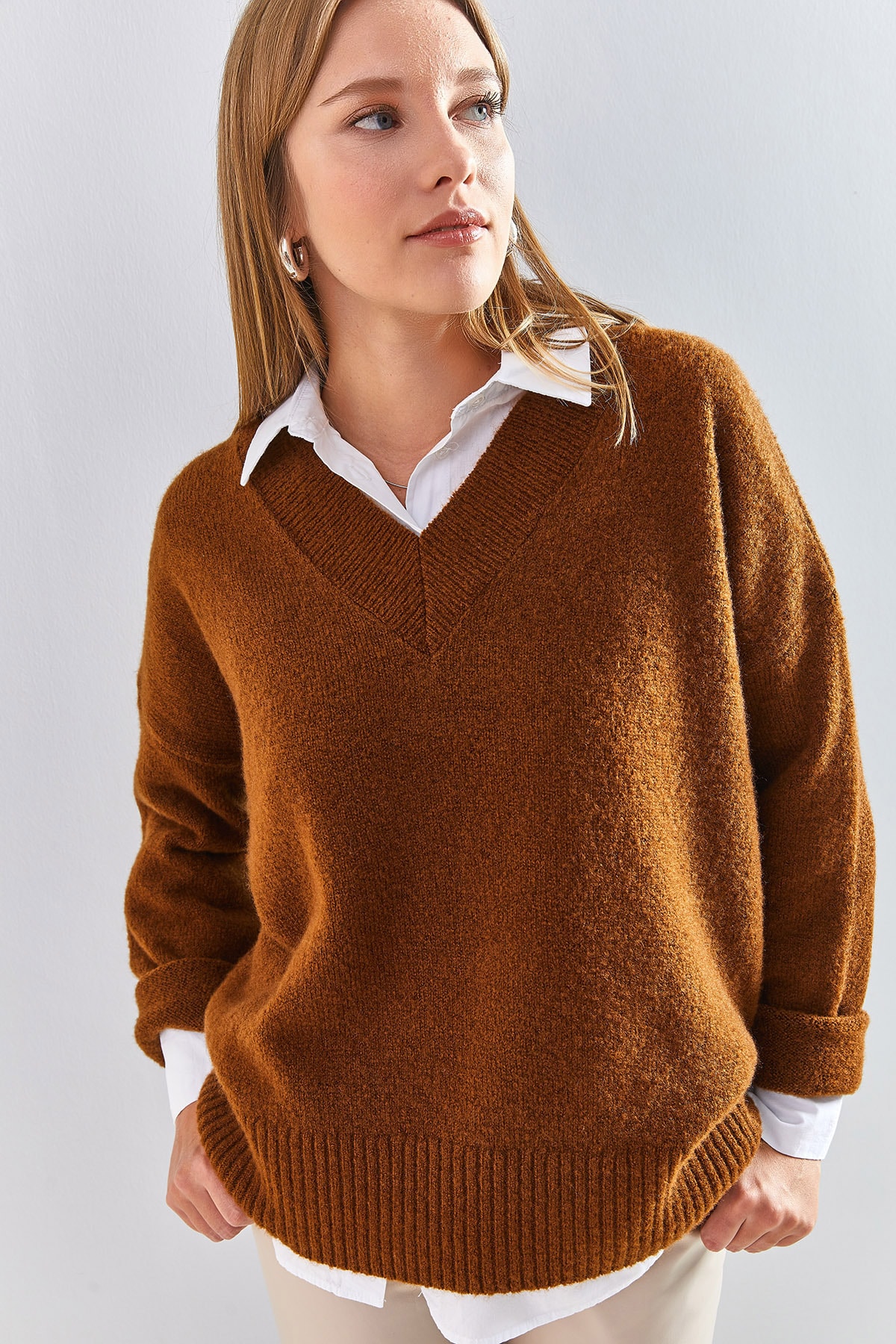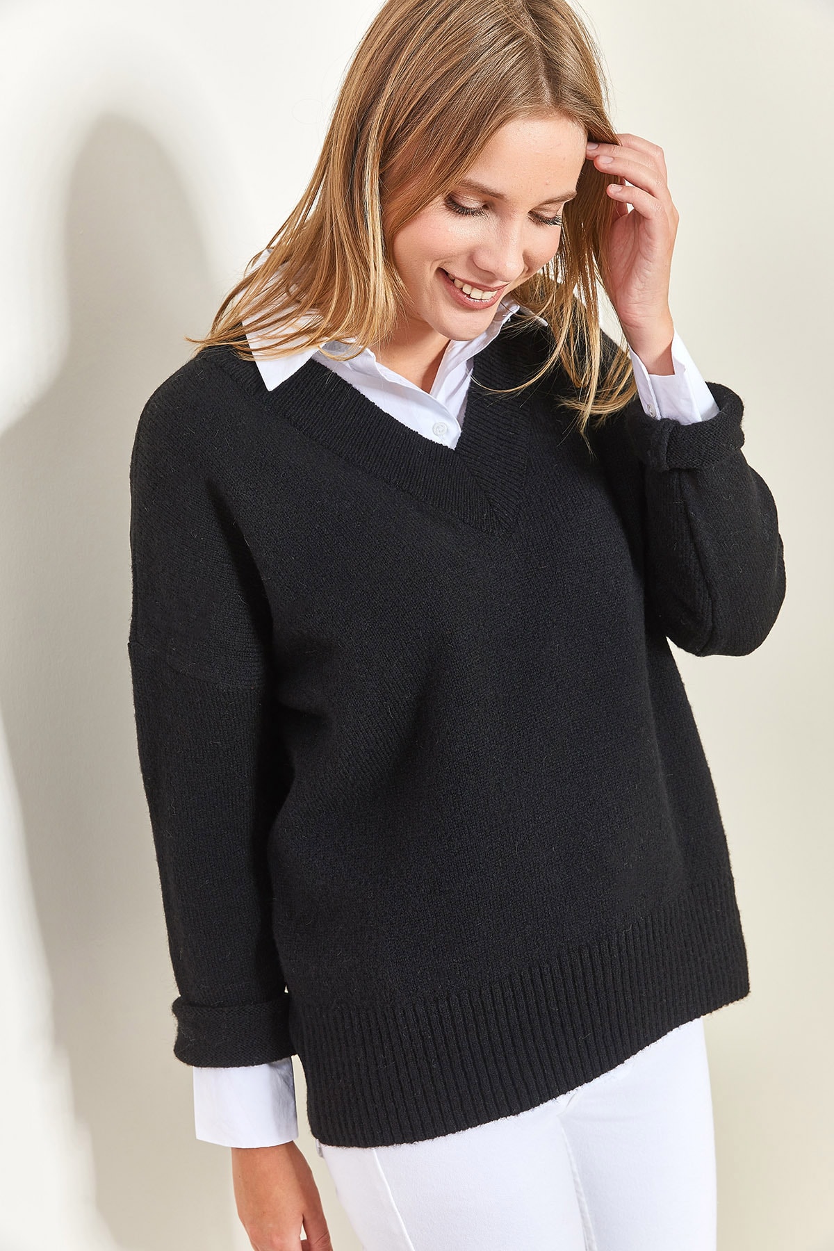V yaka tasarımı ile feminen çizgilere sahip olan bu triko kazak, standart kalıp ve boyuyla her vücut tipine uyum sağlıyor.