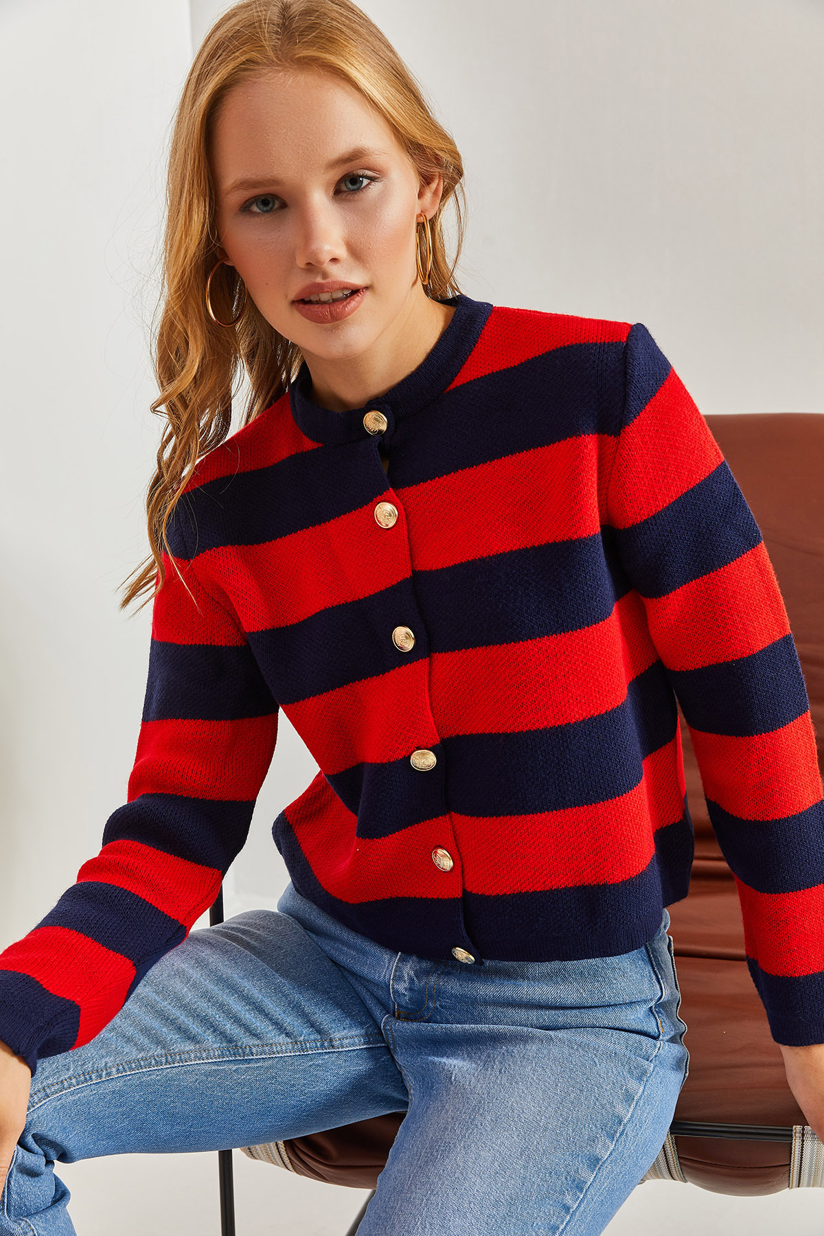 Günlük kullanım için ideal, rahat ve şık bir tasarım sunan kadın metal düğmeli kalın çizgili triko hırka