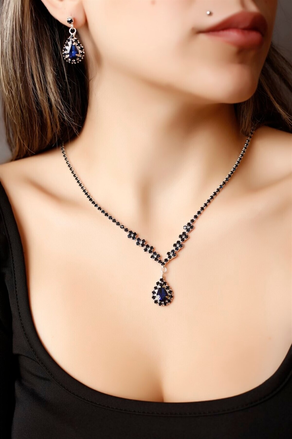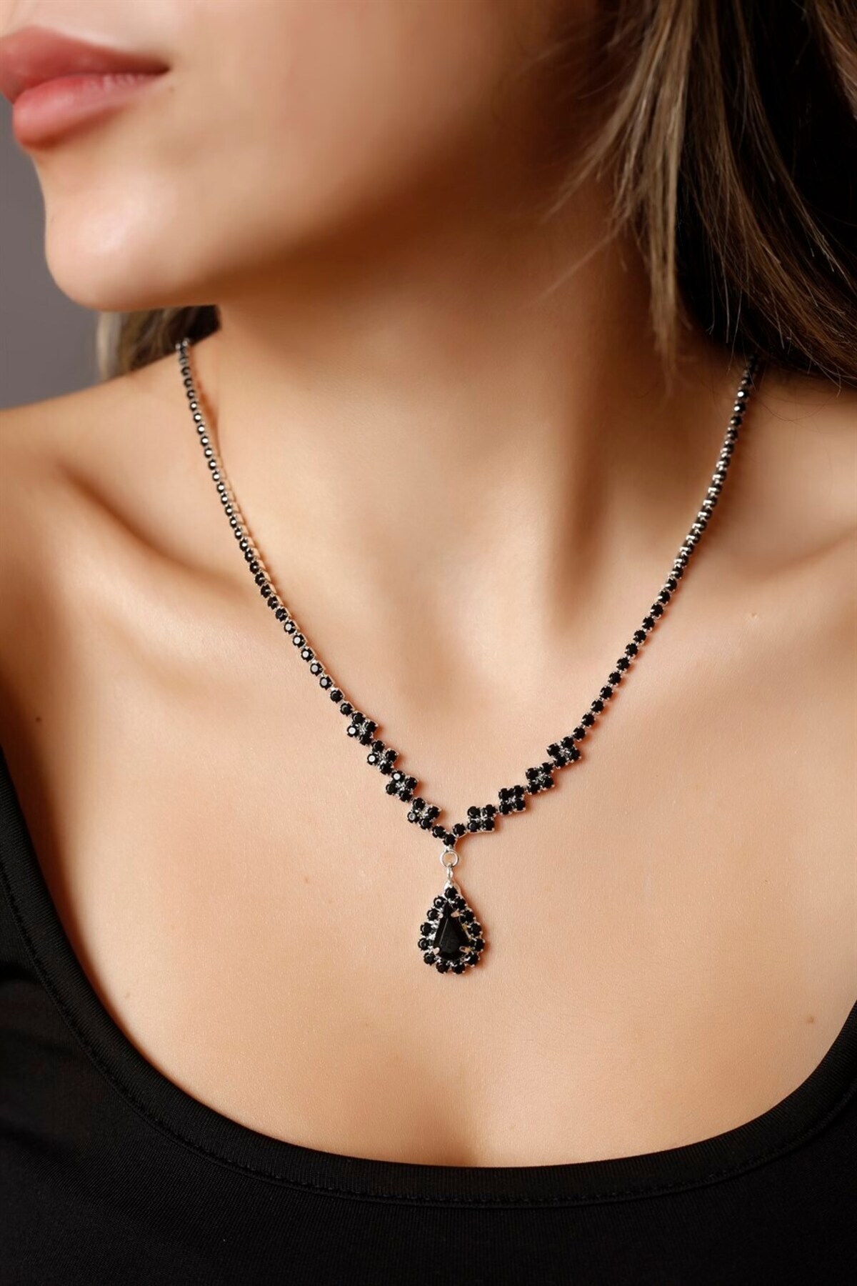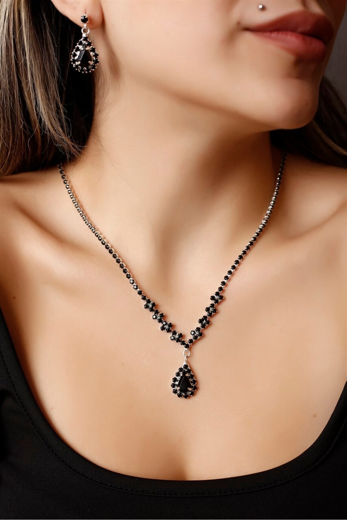 Zarif tasarımıyla göz alıcı bir görünüm sunan siyah su yolu zirkon taşlı kolye küpe seti, özel günlerinizde şıklığınızı tamamlar