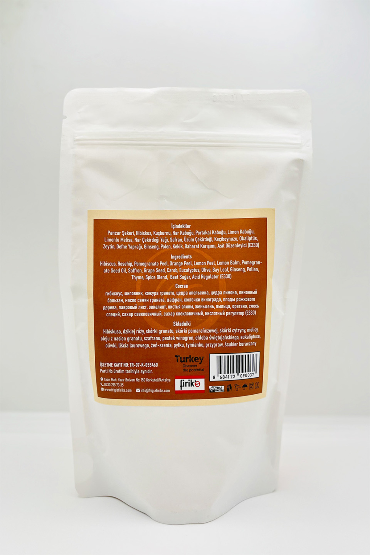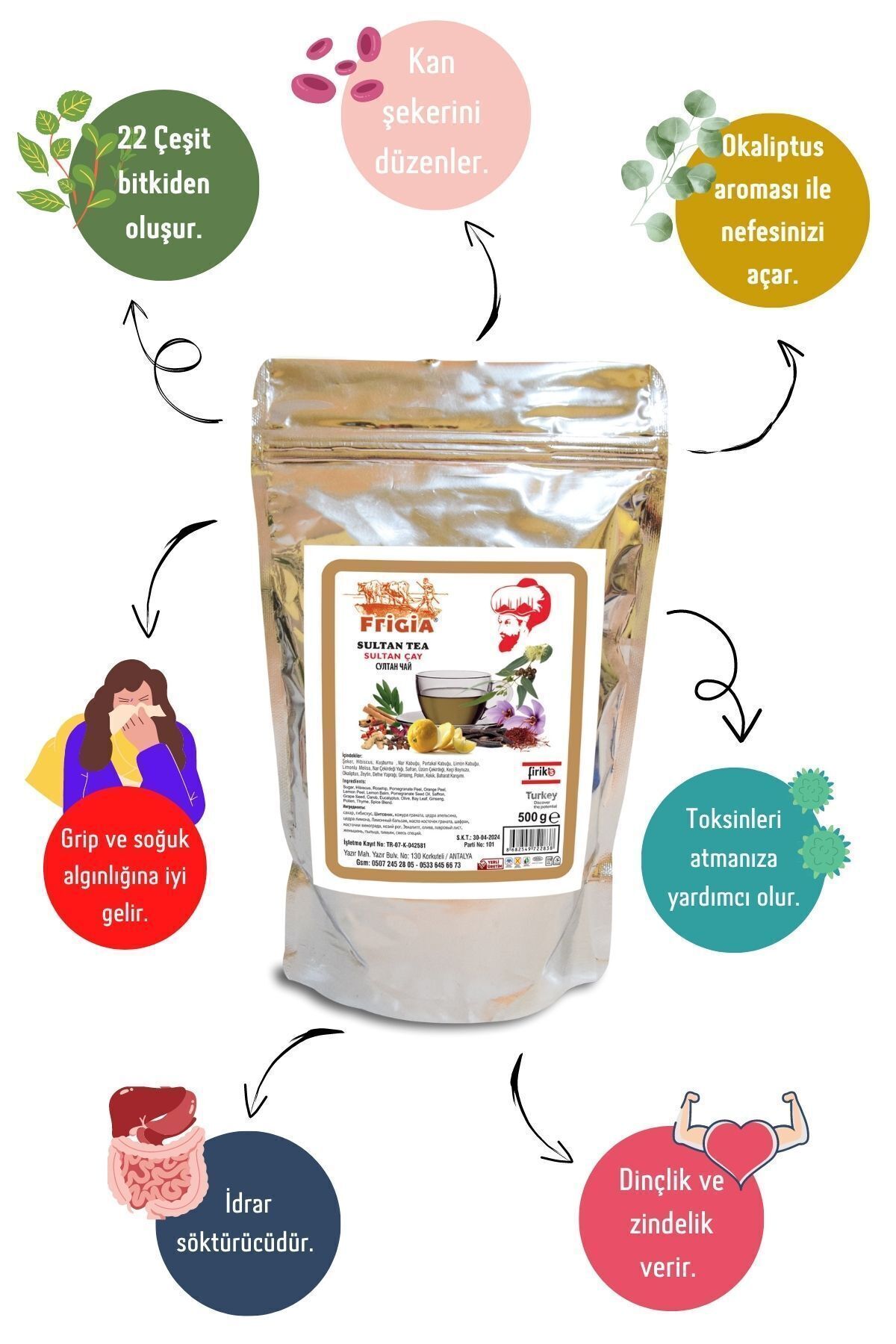 500 g sultan çayı içindekiler Şeker, hibiskus, nar kabuğu, portakal kabuğu, limon kabuğu, limonlu melisa, nar çekirdeği yağı, safran, üzüm çekirdeği, keçiboynuzu, okaliptüs, zeytin, defne yaprağı, ginseng, polen, kekik, baharat karışımı Kullanım koşulları Içerisindeki okaliptüsün etkisini kaybetmemesi için cam kavanozda muhafaza ediniz