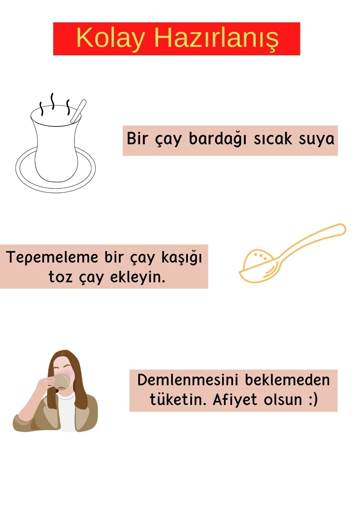 Hazırlanışı 1 çay bardağı sıcak suya dolu bir çay kaşığı ya da 1 su bardağına dolu 2 çay kaşığı ekleyip demlenmesini beklemeden tüketebilirsiniz