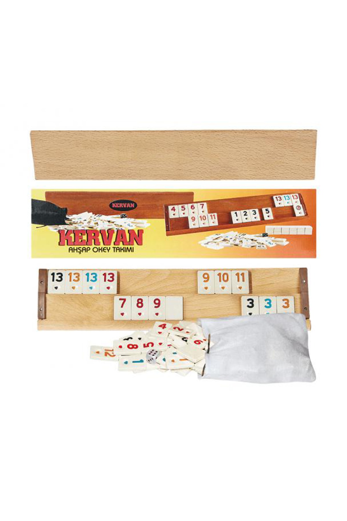 Kervan ağaç okey büyük ürün i?Çeriği 4 adet büyük boy ahşap istaka, 106 adet melamin taş, 1 adet zar ve 1 adet taş toplama kesesinden oluşur.
