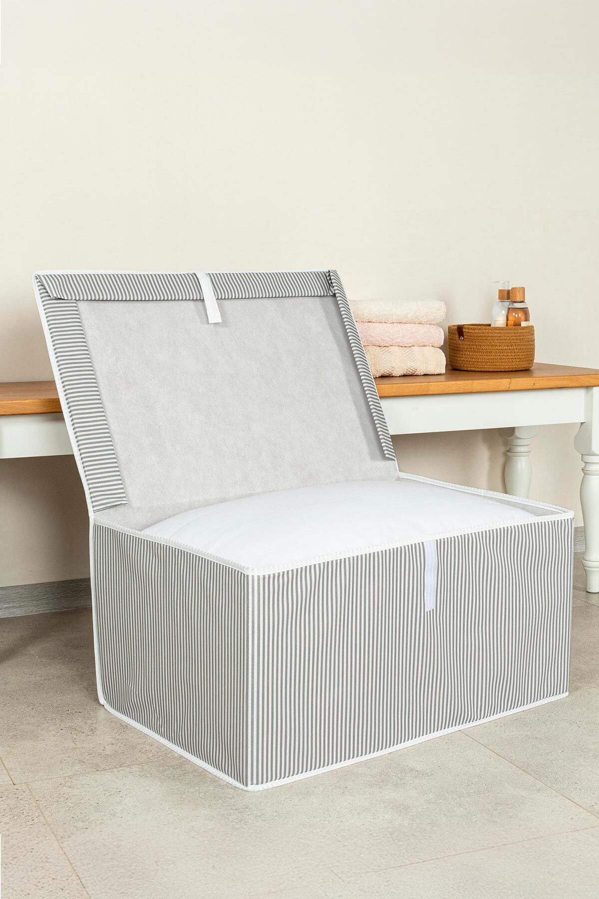 Renk: Modern ve sade dekorasyonlara uyum sağlayan gri tonları Kullanım Alanları: Baza düzenleyici: Yorgan, battaniye, yastık gibi büyük eşyalarınızı saklamak için idealdir.