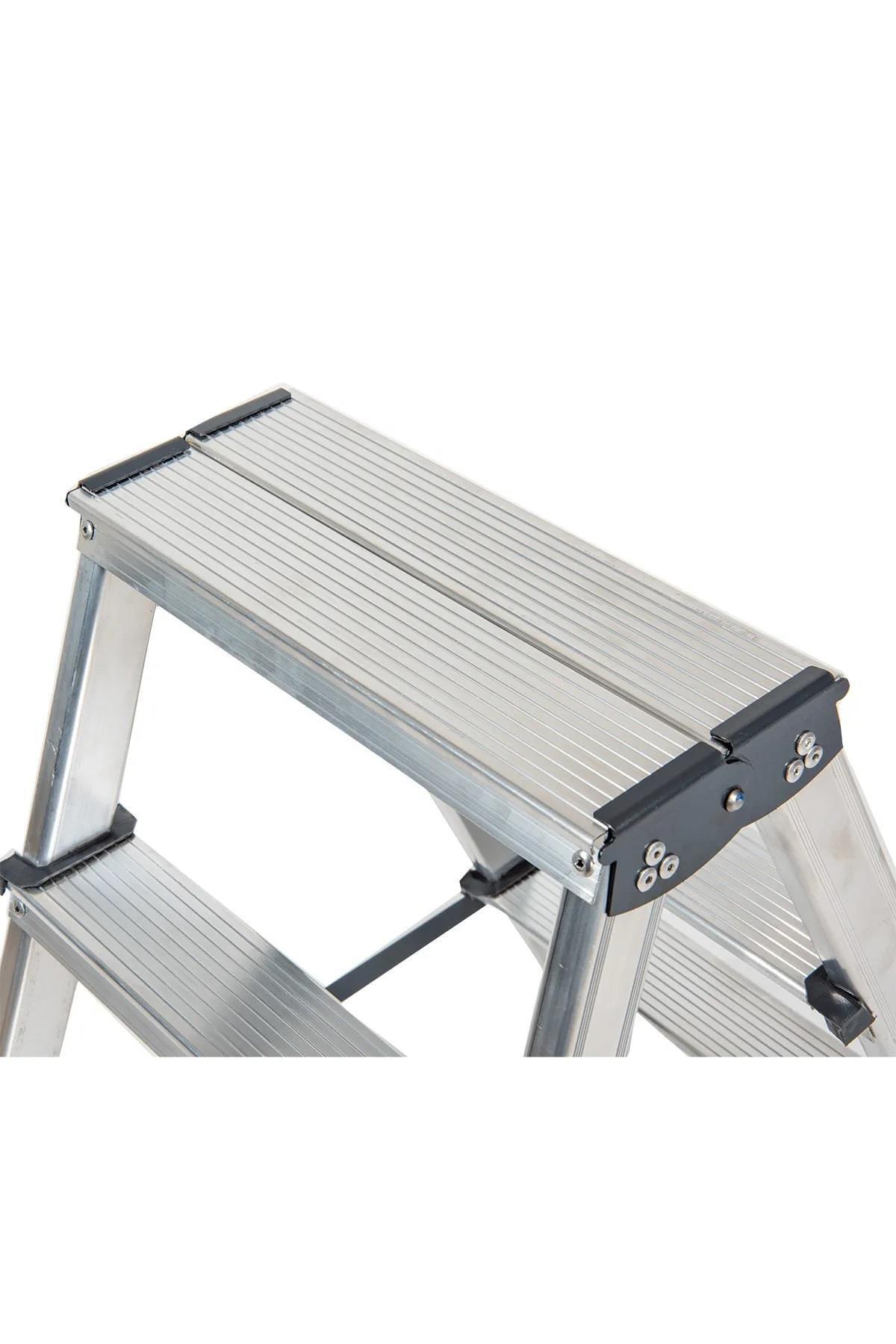 6+6 Alüminyum Çift Çıkışlı Merdiven Paslanmaz Alüminyum Merdiven Çift çıkışlı alüminyum merdiven 1,2 mm et kalınlığı 150 kg taşıma kapasitesi Açık konum yüksekliği 135 cm Ağırlığı 4,60 kg Kaydırmaz basamak tasarımı Çizmeye Karşı ayak ve basamak plastikleri basamak sayısı 6+6 paslanmaz alüminyum acık halde ölçüsü 135