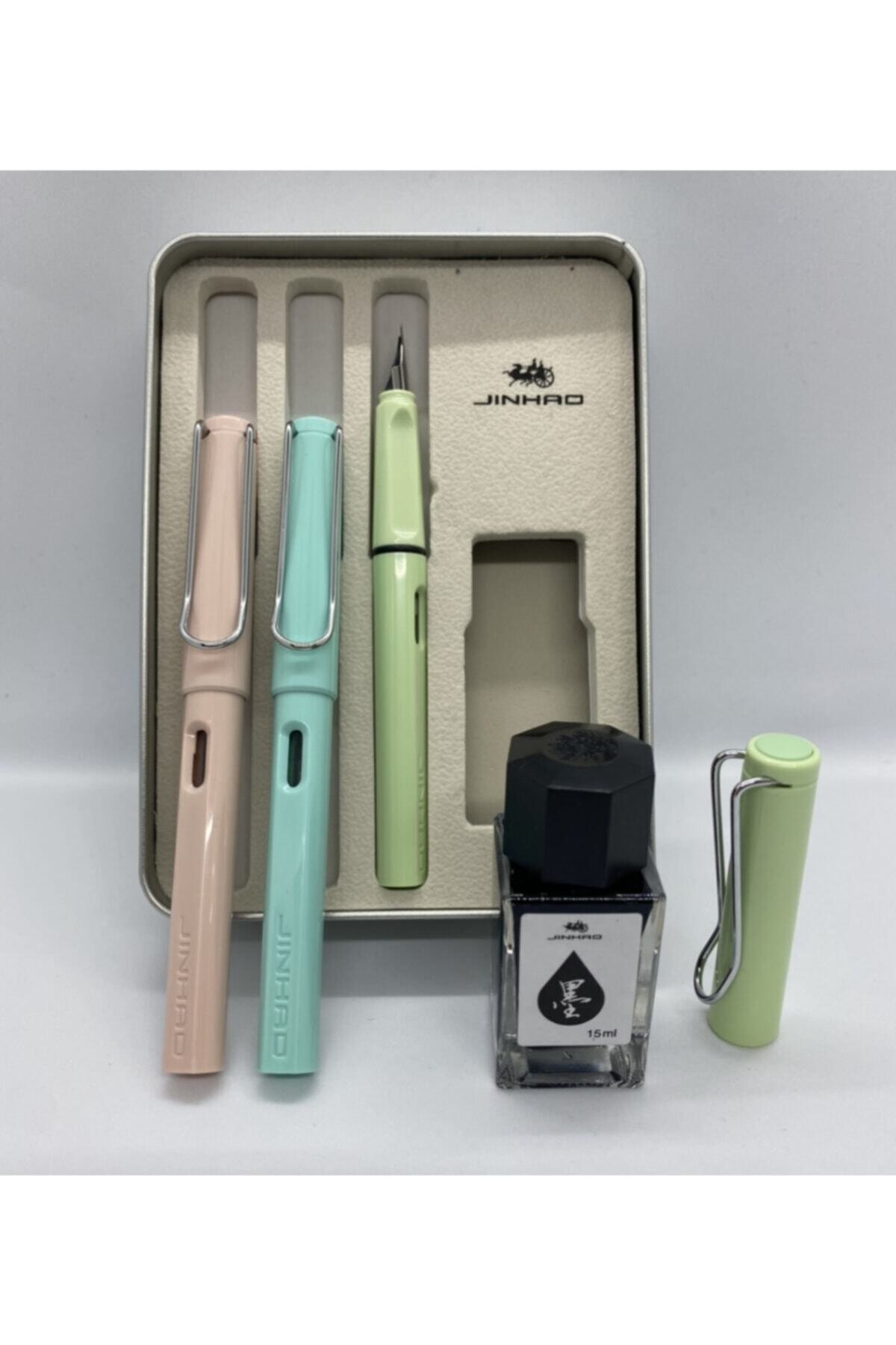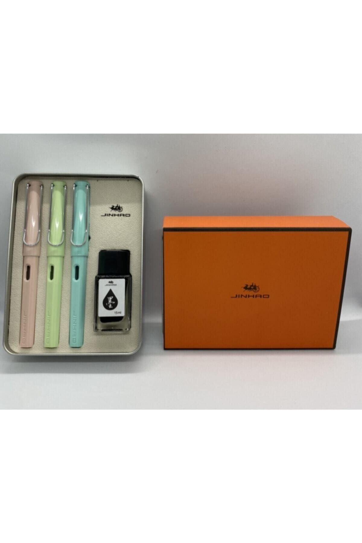 • Jinhao Dolmakalem Seti Hediyelik F uçlu 3 kalem + mürekkep metal kutuda,F uç