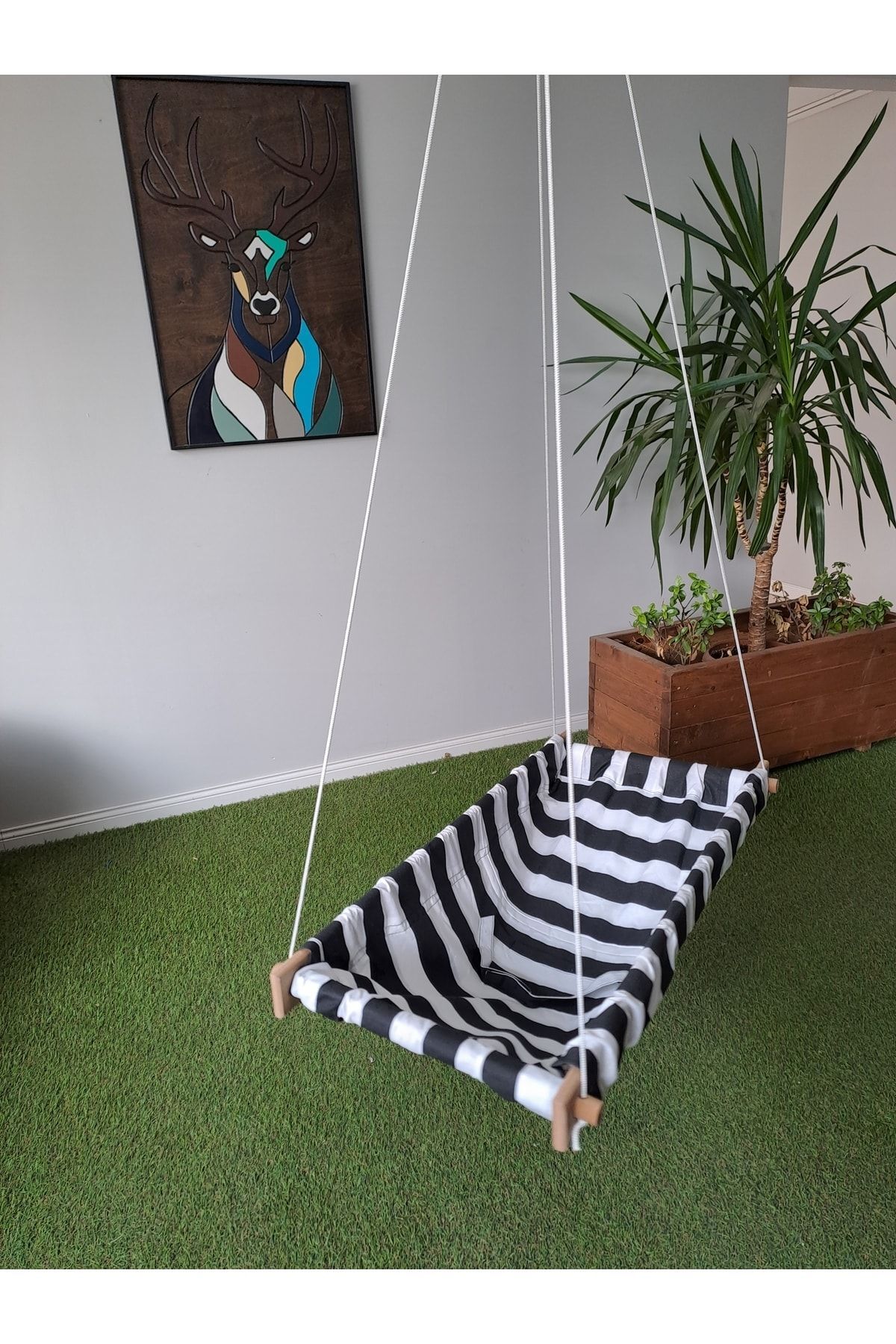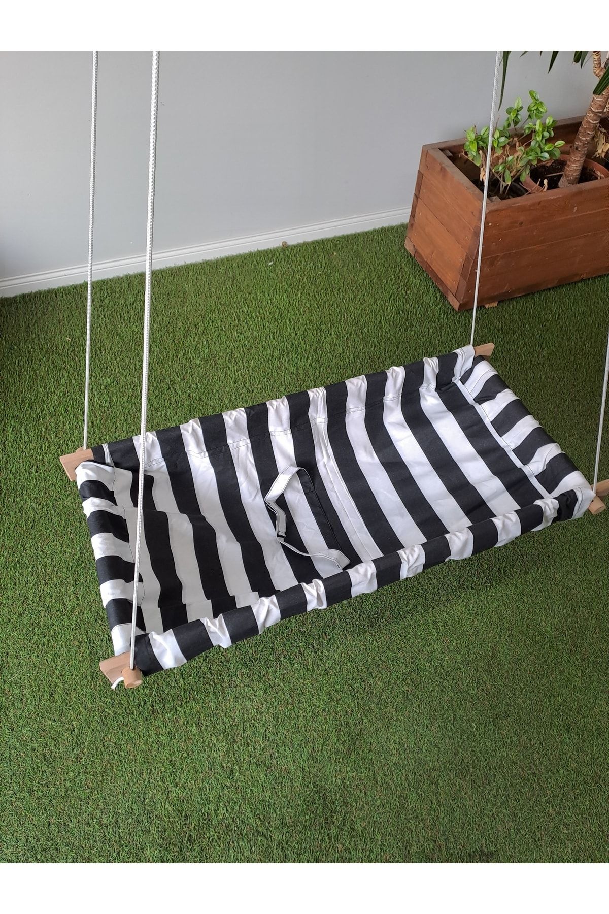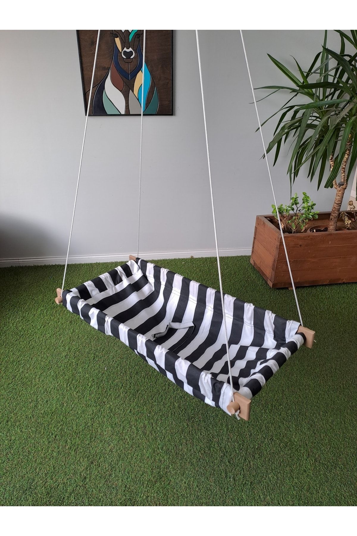 Ahşap kenarlı yaylı zıpzıp bebek hamak kumaş kısımlar %100 Pamuk Gabardindir ve yıkanabilir