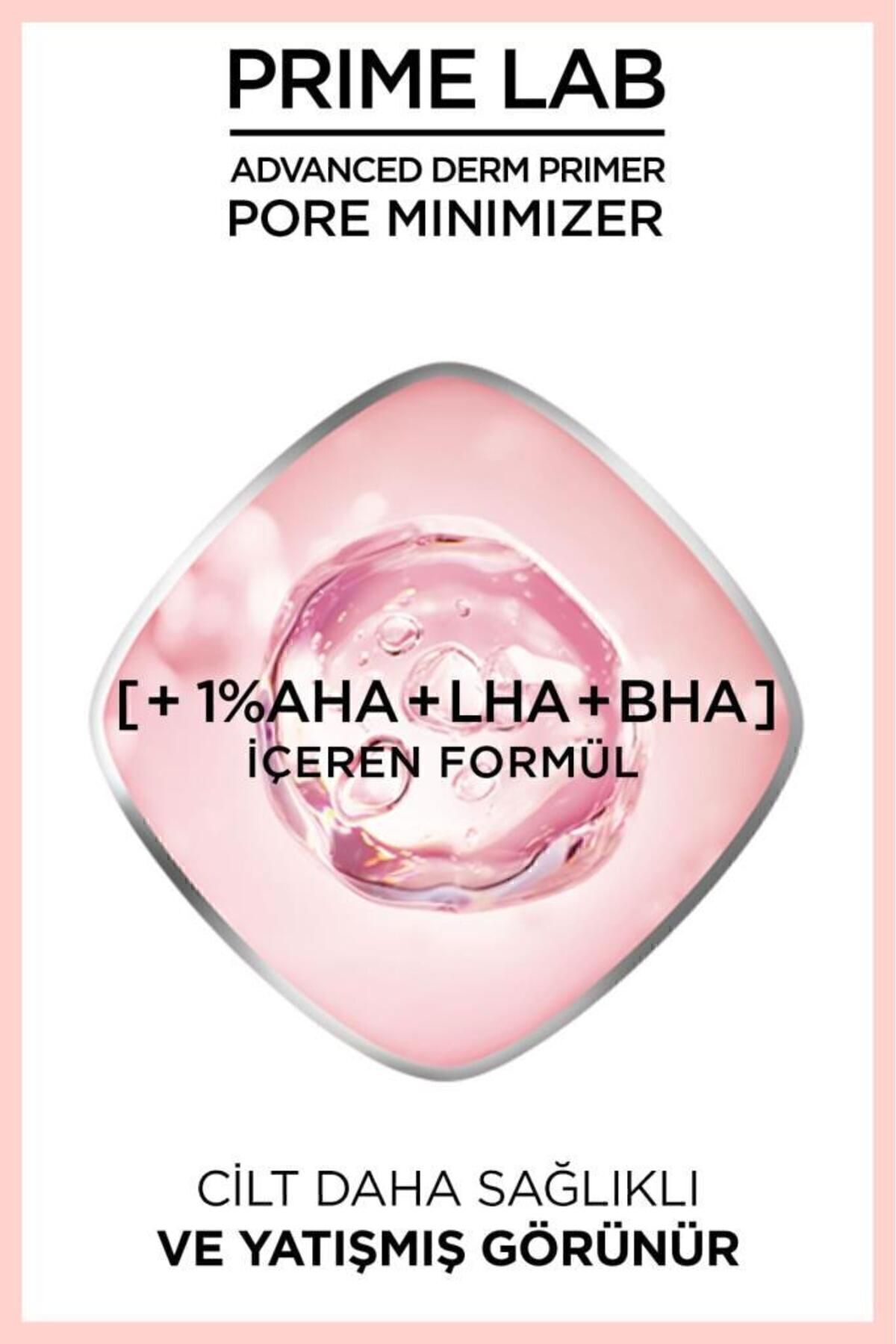 1% [AHA + LHA + BHA] içeren formülü sayesinde cildinizde daha sağlıklı ve yatışmış görünmü hissedin! L'Oréal Paris Prime Lab Pore Minimizer Gözenek Küçültücü Makyaj Bazı anında gözenek, ince çizgi ve kusurların görünümünü azaltır, cildi pürüzsüzleştirir.