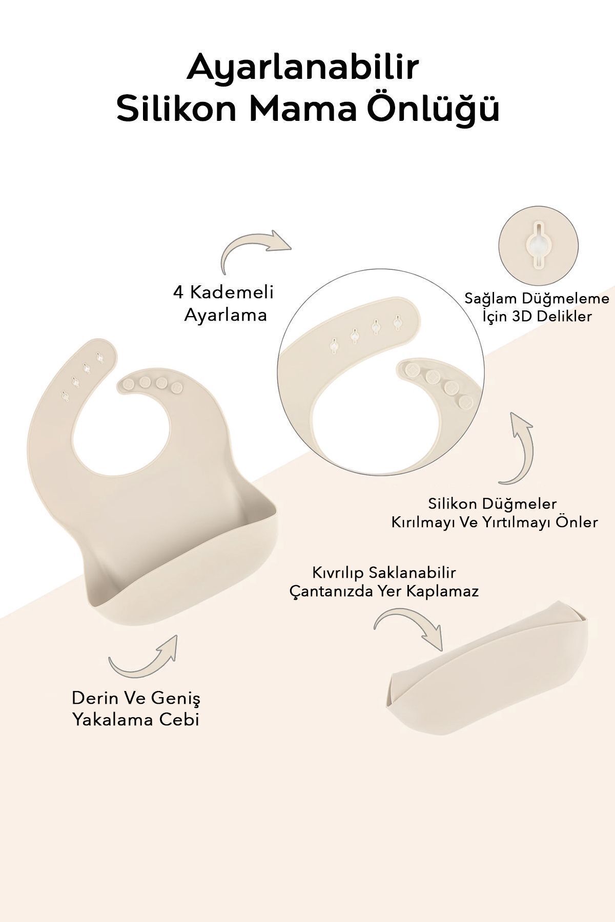 Meleni Baby silikon mama önlüğü 4 güvenli uyum boyutu ve çekilmeyi önlemek için çift kilit ile tasarlanmıştır.