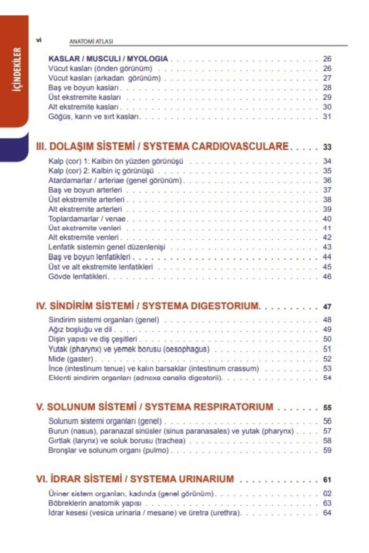Atlas içeriği, Sistematik Anatomi müfredatındaki Genel Anatomi, Hareket Sistemi, Dolaşım Sistemi, Sindirim Sistemi, Solunum Sistemi, İdrar Sistemi, Üreme Sistemi, İç Salgılı Bezler, Sinir Sistemi ve Duyu Organları konularını kapsamaktadır.