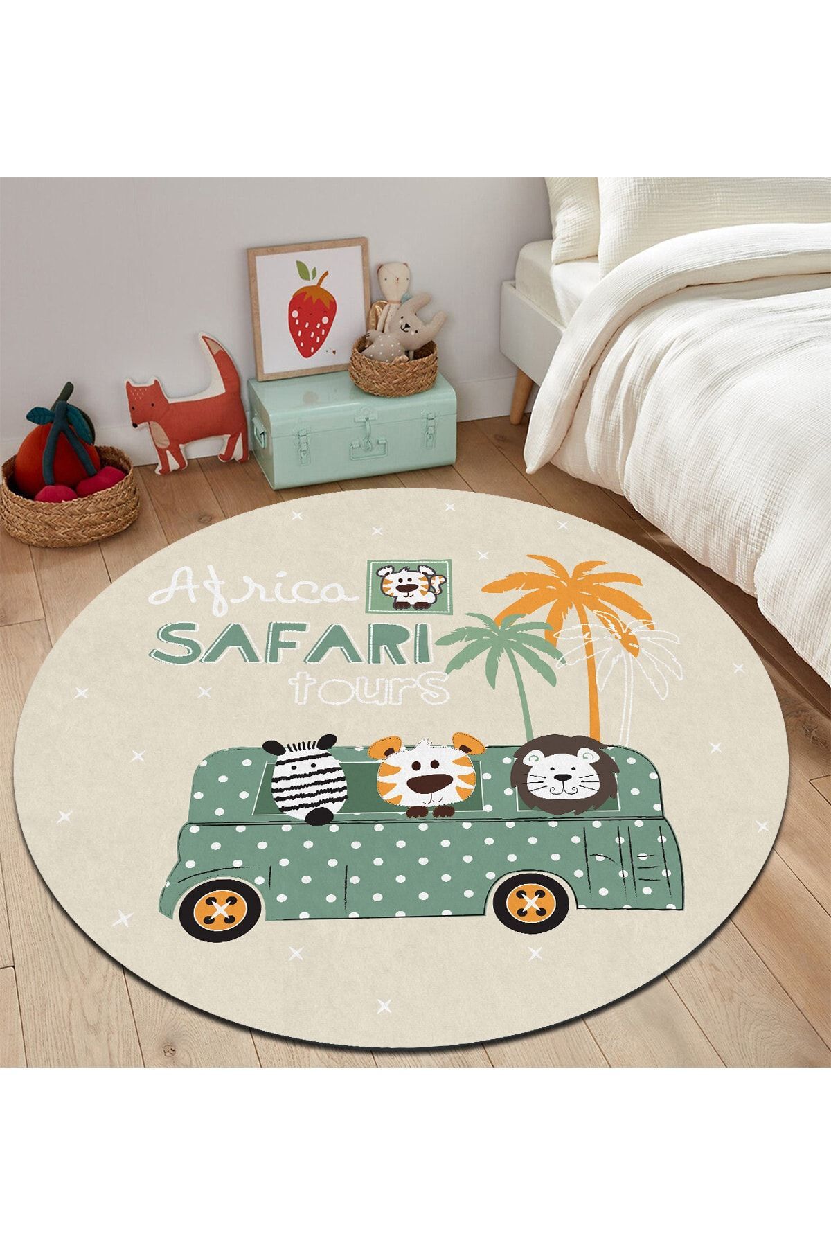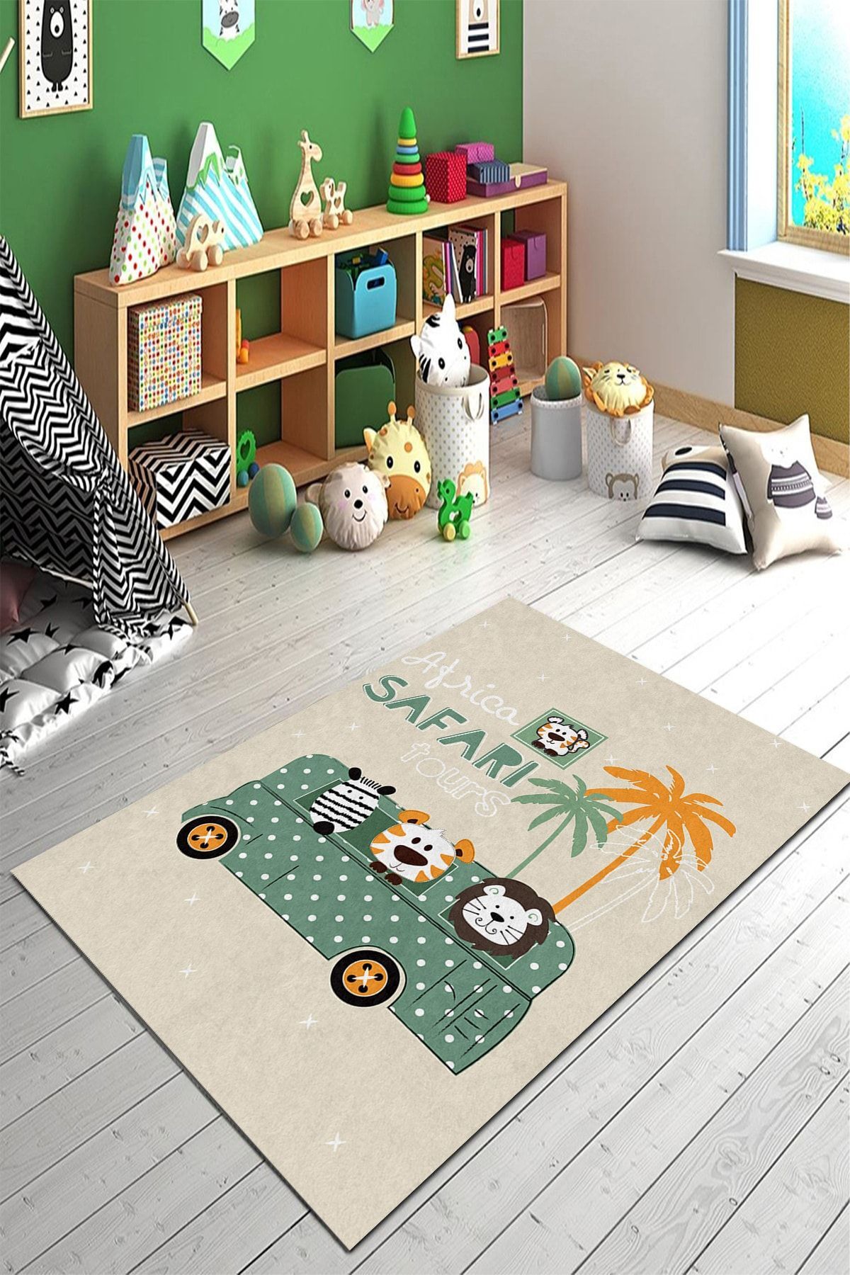 - Canlı yeşil tonlarıyla çocukların odasına neşe katan dijital baskı kaymaz taban halı, güvenli bir oyun alanı sunar.