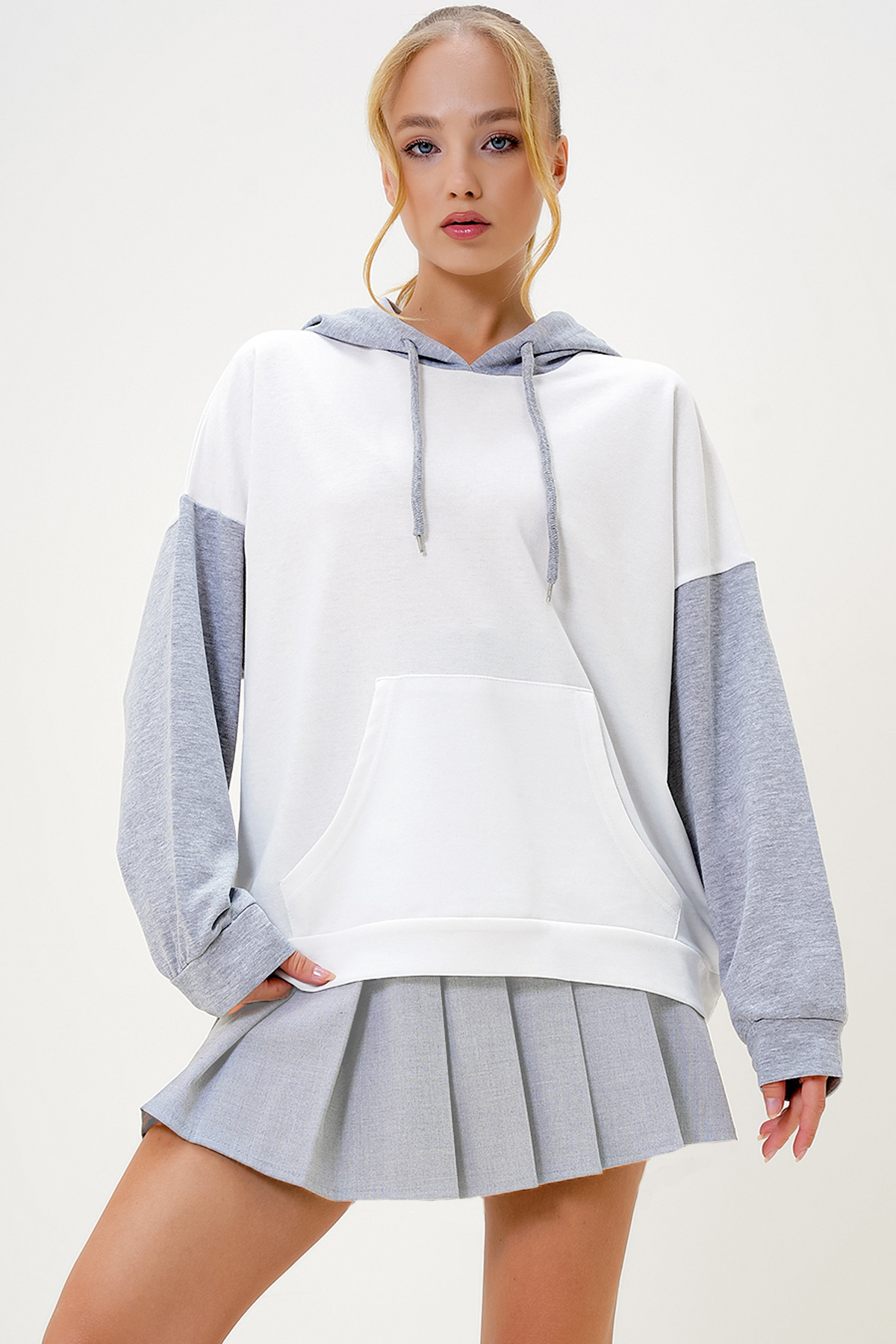 Kanguru cep tasarımı ile hem şık hem de fonksiyonel bir kullanım sunar