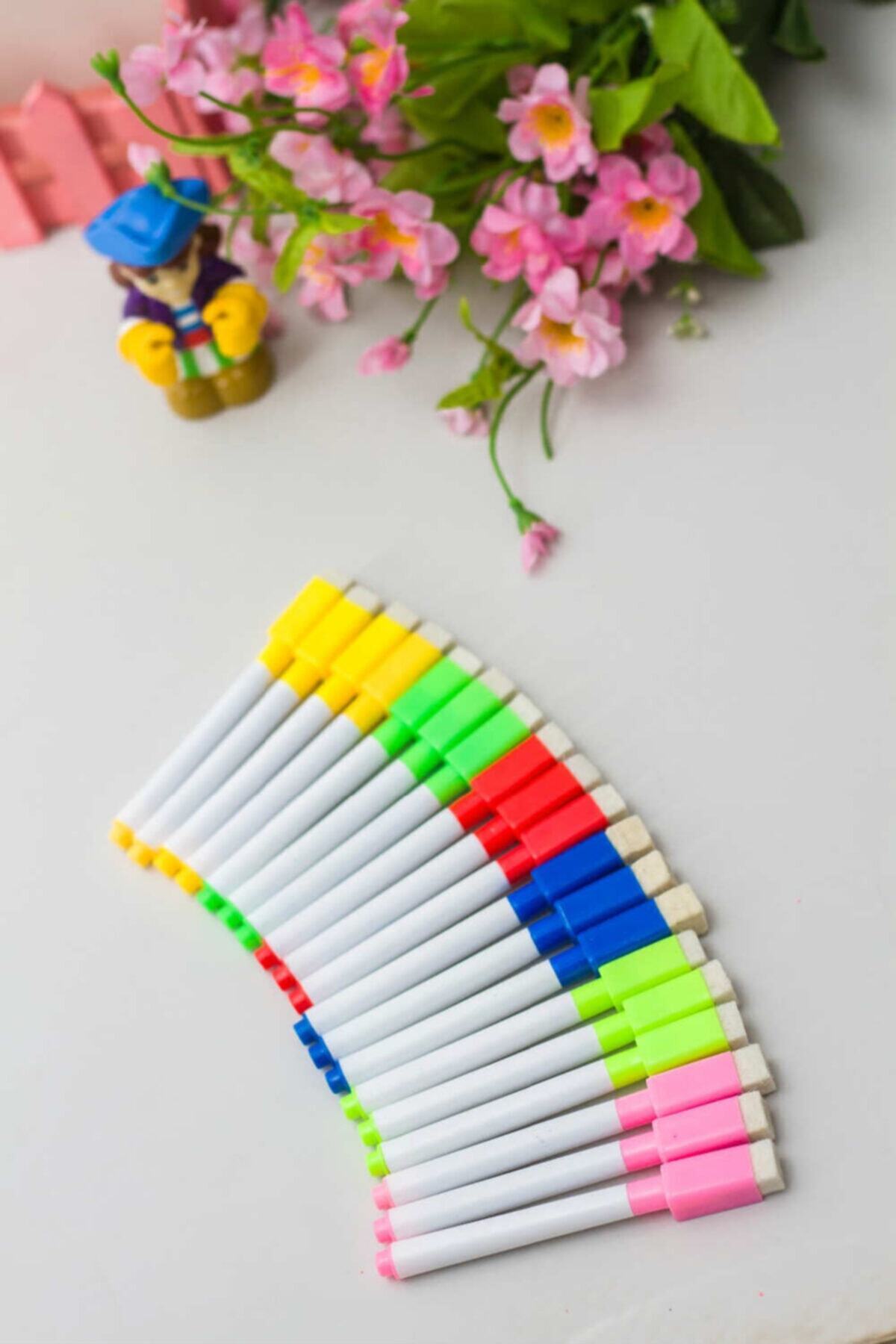 Mıknatıslı silgili akıllı tahta kalemi Silinibilir beyaz tahta kalemidir Her renkten 2 adet olmak üzere 6 farklı renk, topla 12 adet kalem gönderilir 2 adet siyah 2 adet mavi 2 adet sarı 2 adet kırmızı 2 adet yeşil 2 adet pembe Tepesindeki kapağı silgili ve mıknatıslıdır