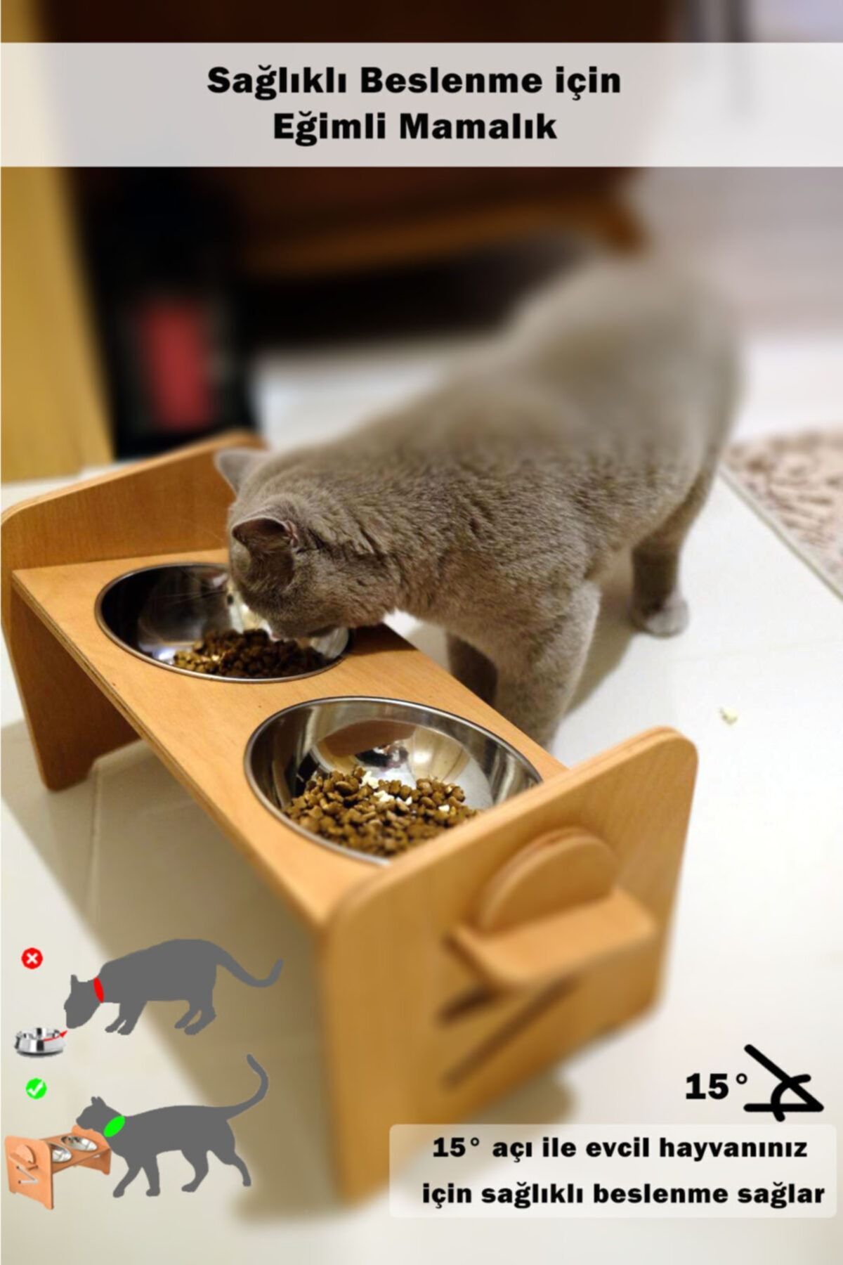 Tüm yüksekliklerde 15° eğim sayesinde evcil hayvanlarınızın omurgasını zorlamadan konforlu ve sağlıklı bir beslenme sağlar.