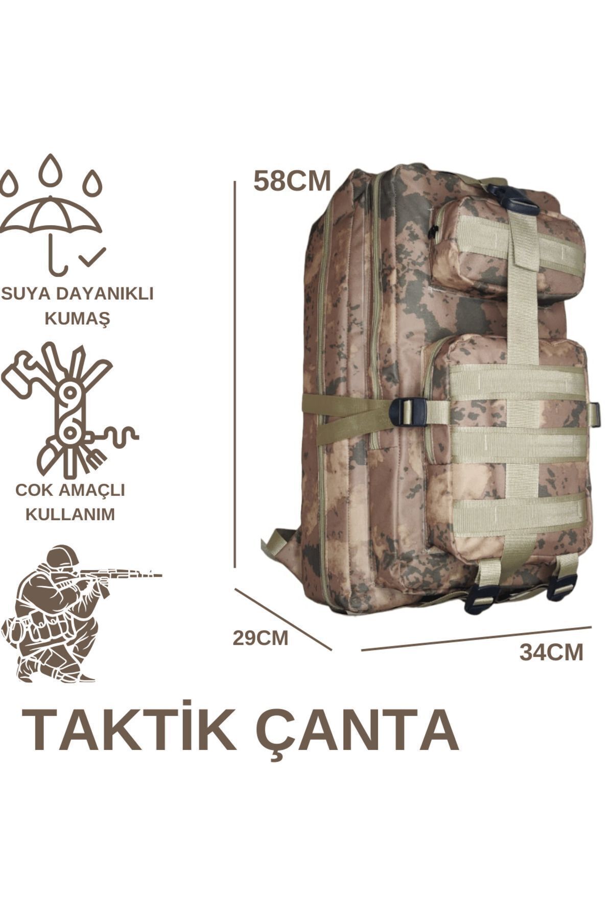 Öne Çıkan Teknik Özellikler: ● Hacim: 65 Litre kamp çantası ● Malzeme: DuPont 600D Denye kumaş ● Renk: Çöl rengi askeri çanta ● Boyut: 55 x 29 x 30 cm ● Ağırlık: 1000 g ● Kapasite: 60 L ve üzeri askeri çanta ● Desen: Düz ● Kullanım Alanları: Sportswear çanta, Outdoor çanta Çift fermuarlı geniş bölmeleri, organizerli ön cebi ve yan cepleri ile kullanım kolaylığı sunar.