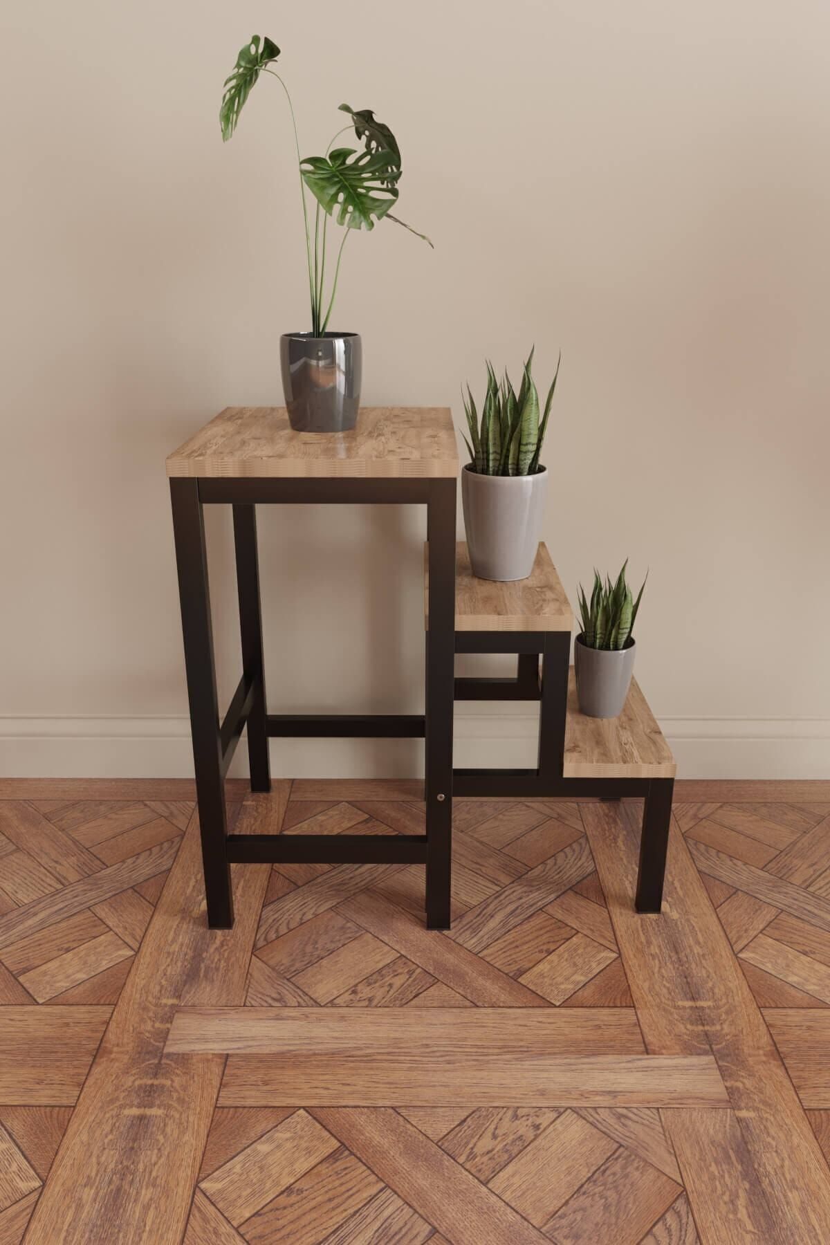 ÜRÜN ÖZELLİKLERİ Yükseklik : 61-63 Genişlik: 34-37 Derinlik: 31-33 Şık ve kullanışlı tasarımıyla birlikte merdiven,çiçeklik,sehpa ve tabure olarak kullanılabilir.