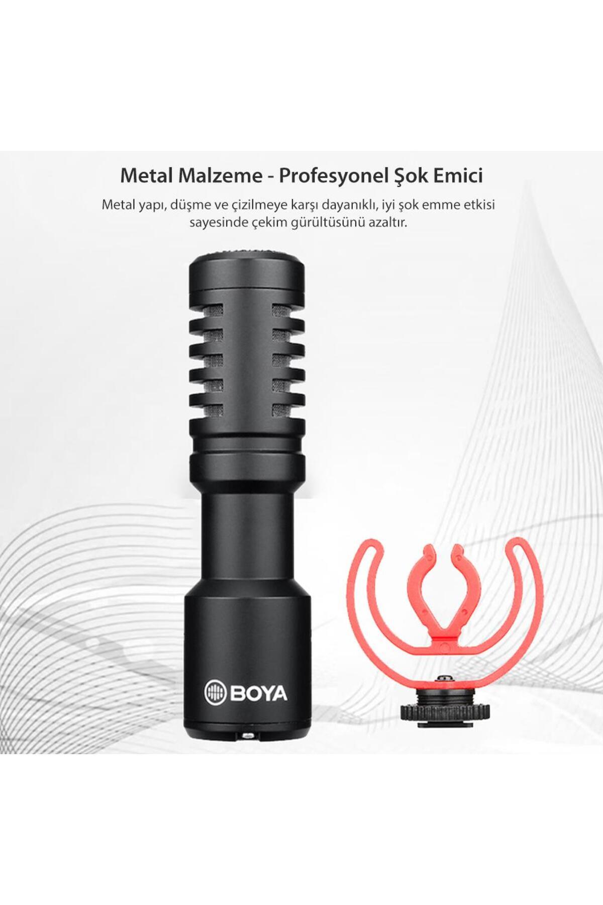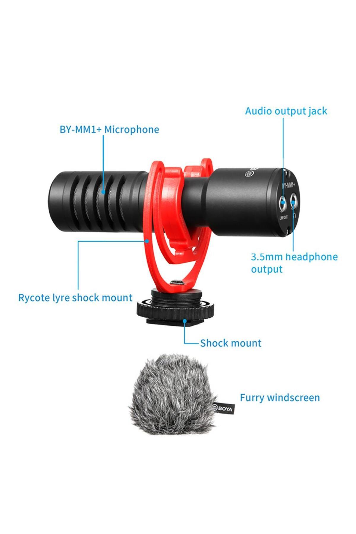 Paket İçeriği: BY-MM1+ Mikrofon, rüzgar kesici tüy, mikrofon süngeri, taşıma kılıfı, 1 adet TRRS konnektör, 1 adet TRS konnektör, şok emici bağlantı aparatı, ingilizce kullanım kılavuzu.