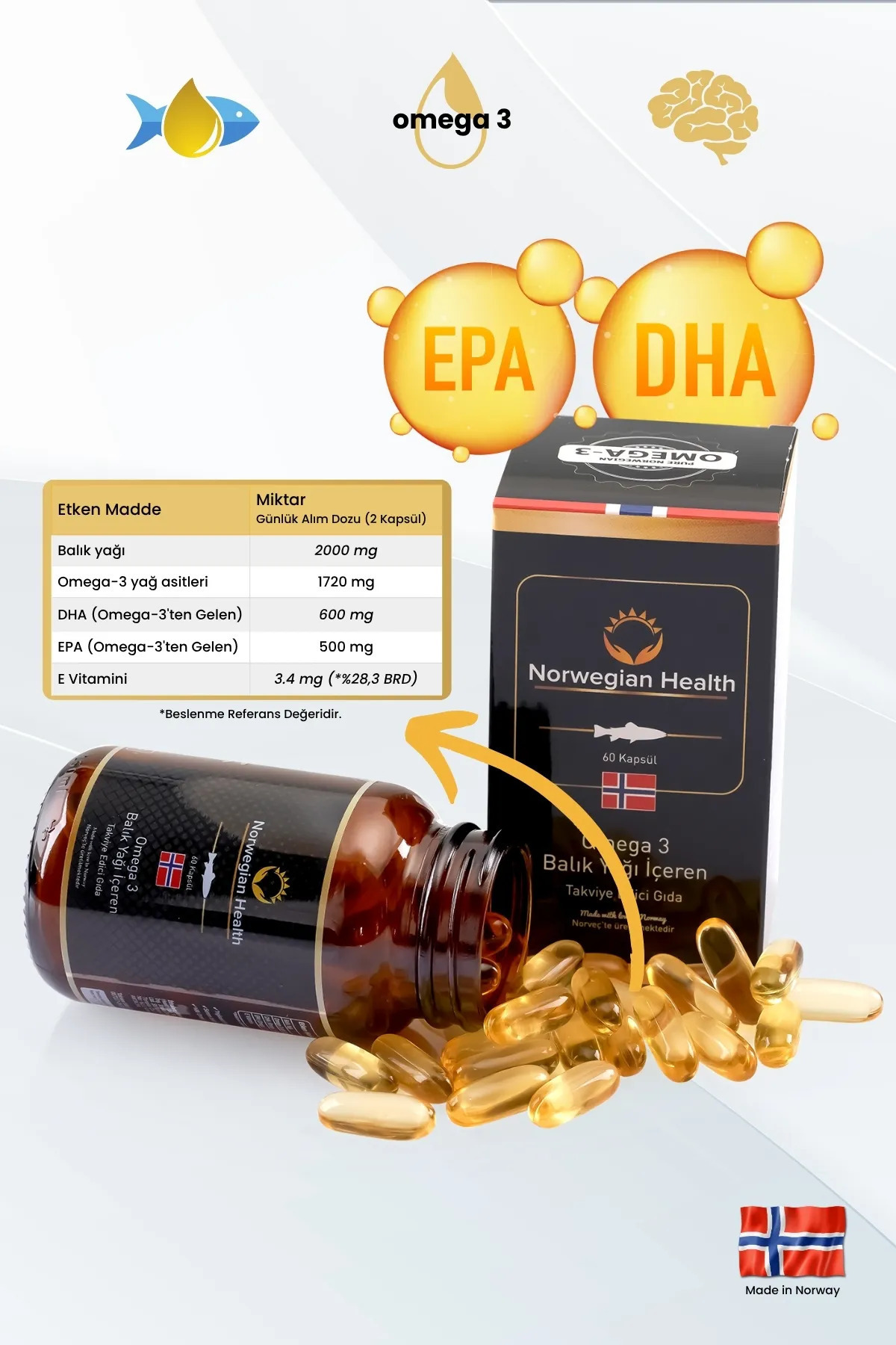 Norwegian Health Omega-3 60 Kapsül 1000 mg x 5 adet İçindekiler Balık yağı, Kapsül, E vitamini (D-alfa tokoferol) Ürünün Başlıca Özellikleri formdadır.
